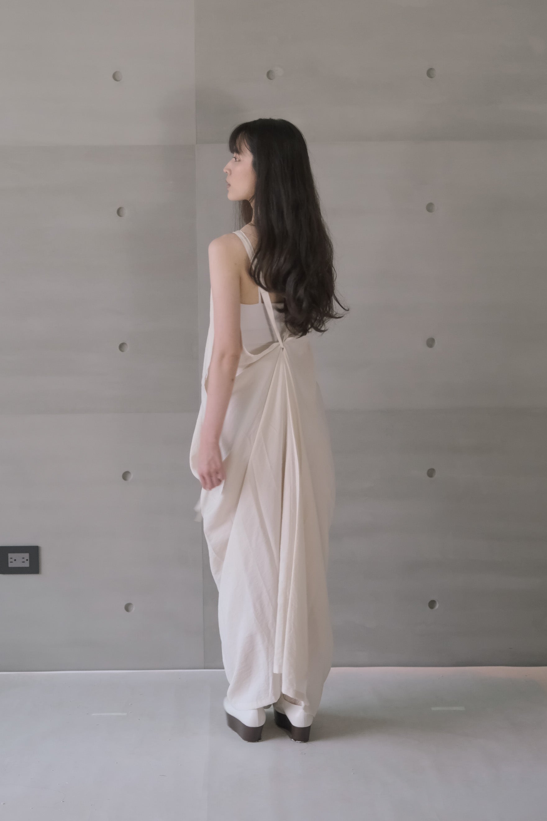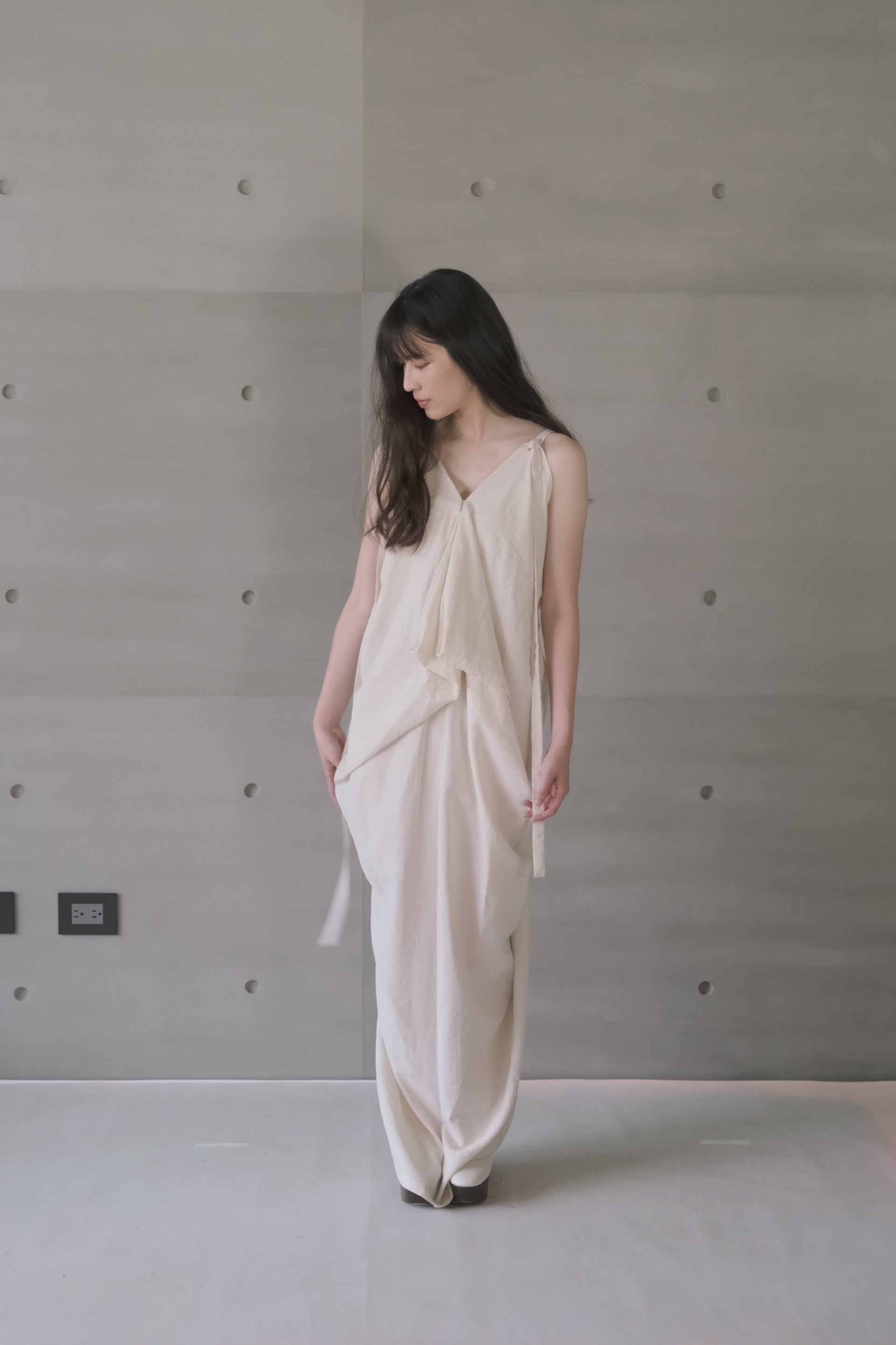 以矩形為基礎的版型發想,延伸出極簡主義的結構語彙。全件採用布料零浪費剪裁法製作,保留原布幅尺寸與邊緣,不僅體現對資源的尊重,也強調布料自然的垂墜與厚度。輪廓呈現柔和的繭形結構,兼具空氣感與份量感,行走之間展現輕盈的雕塑氣息。背部大面積挖空設計,呼應羅馬式服裝的鬆垂與裸露語言,營造出剛柔並濟的氛圍,優雅中帶有一絲前衛實驗感。