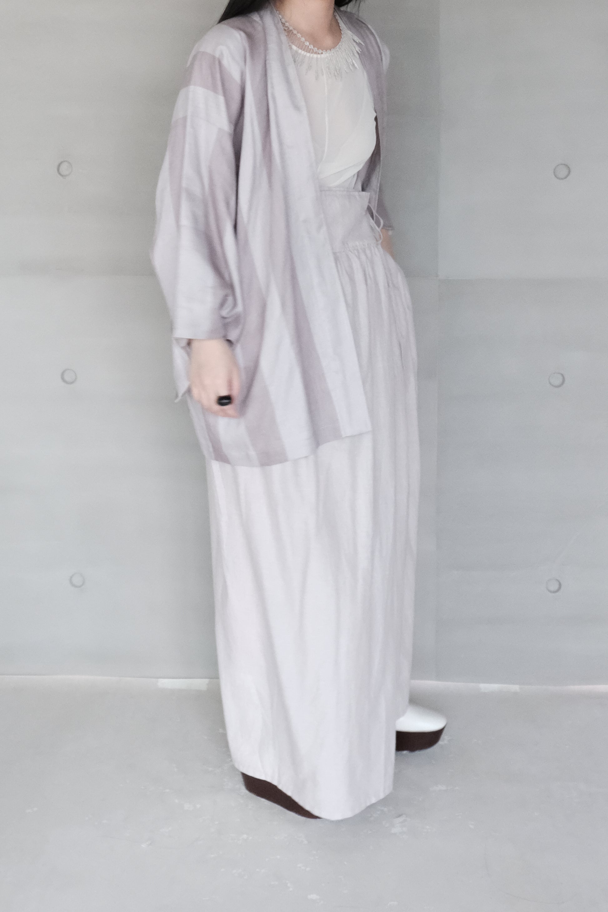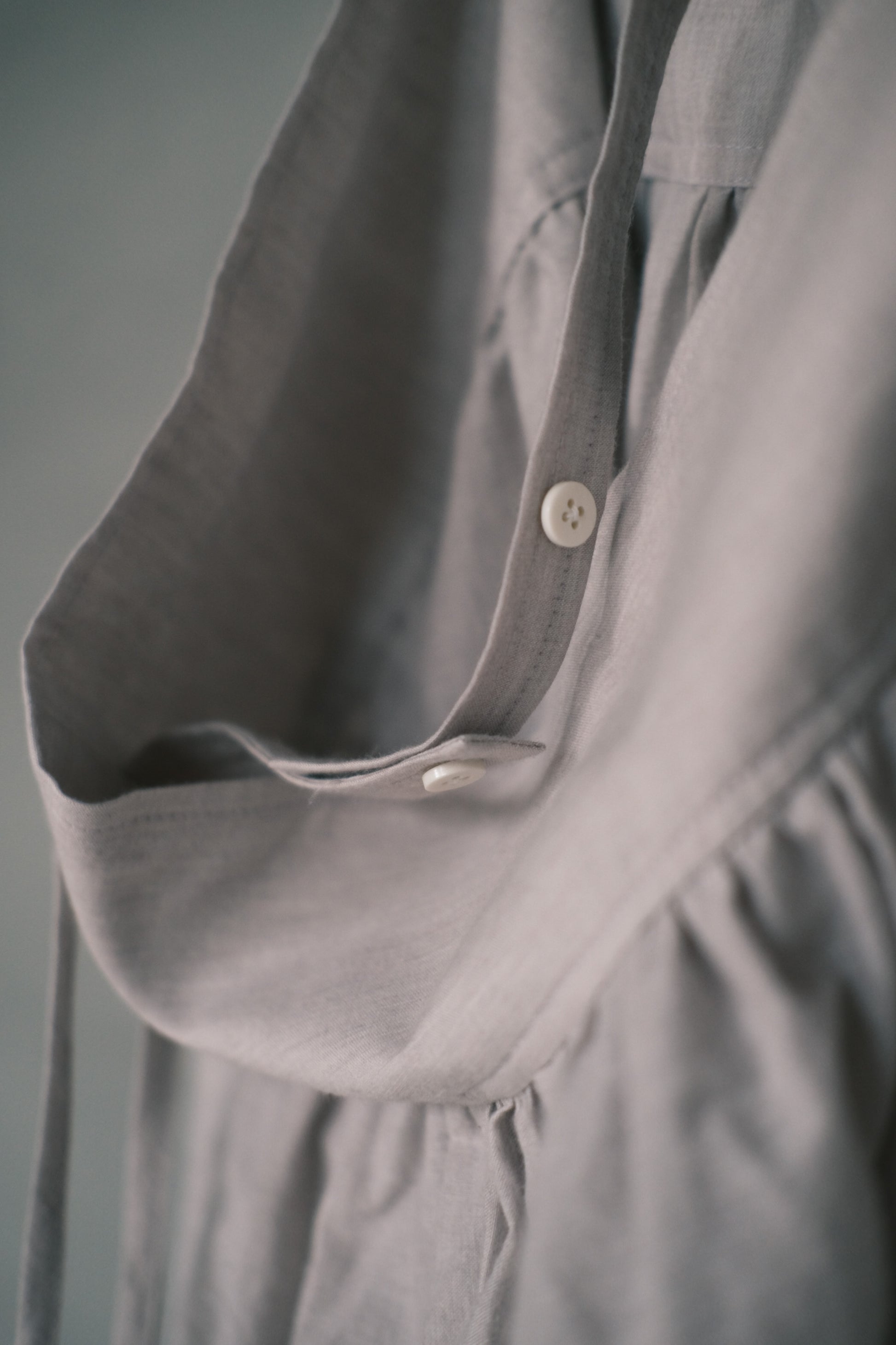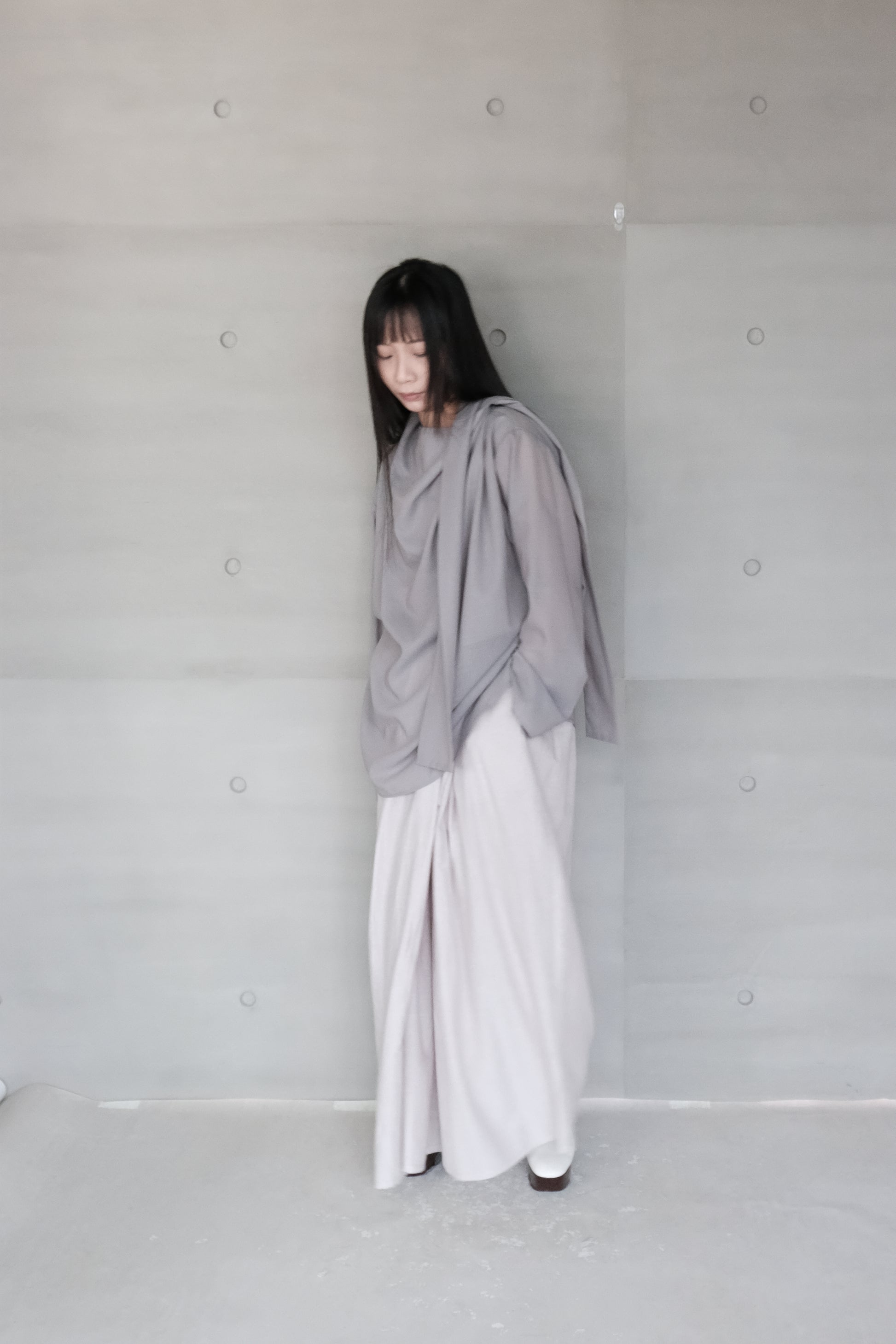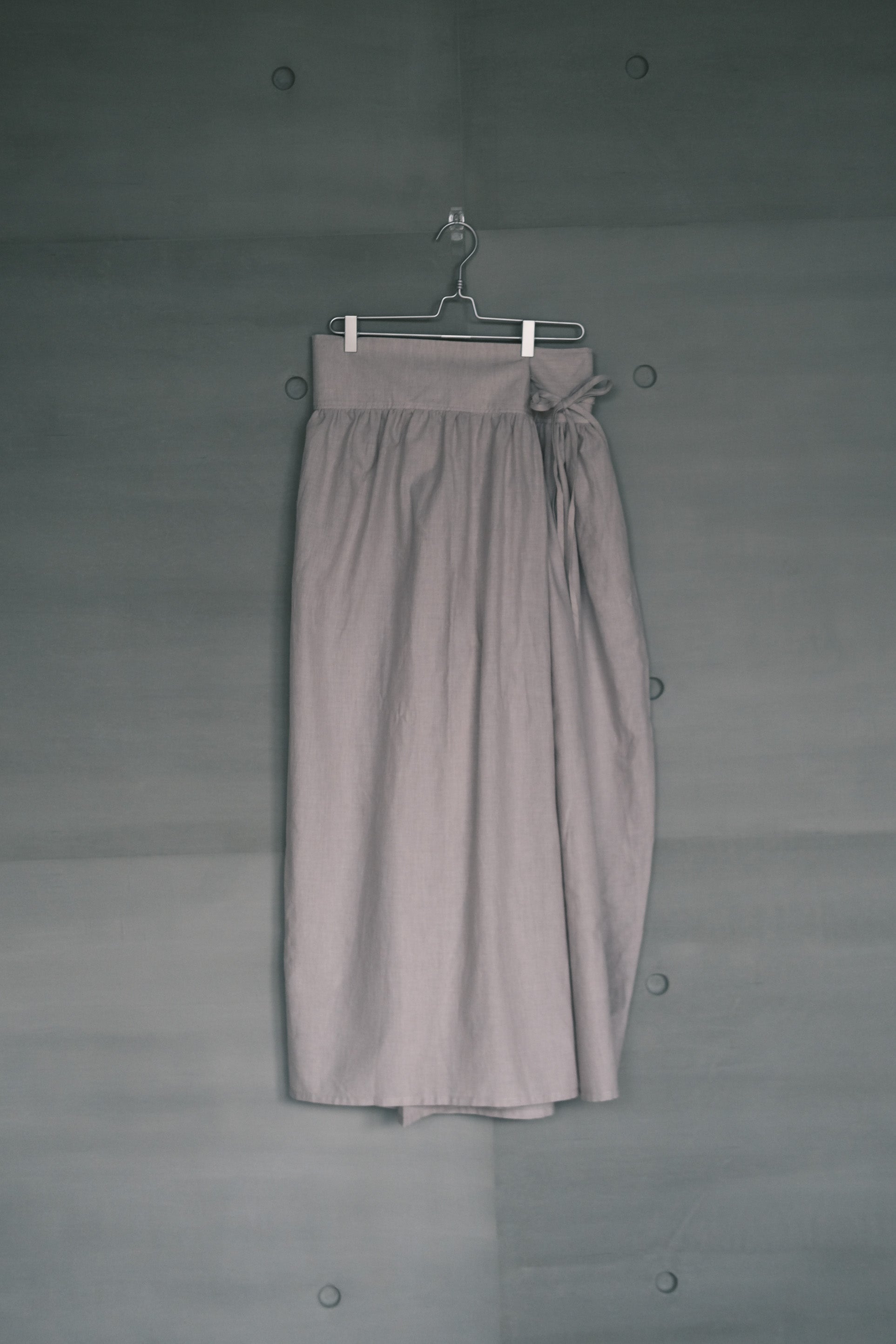 Crafted from organic cotton naturally dyed with blueberries by a Japanese mill, this fabric carries a soft and nuanced hue. The wide-leg silhouette features asymmetric pleated details, creating a layered and sculptural effect. The waist is secured with an inner buckle, while an oversized pleated wrap tie defines the outer layer, balancing structure with fluidity.