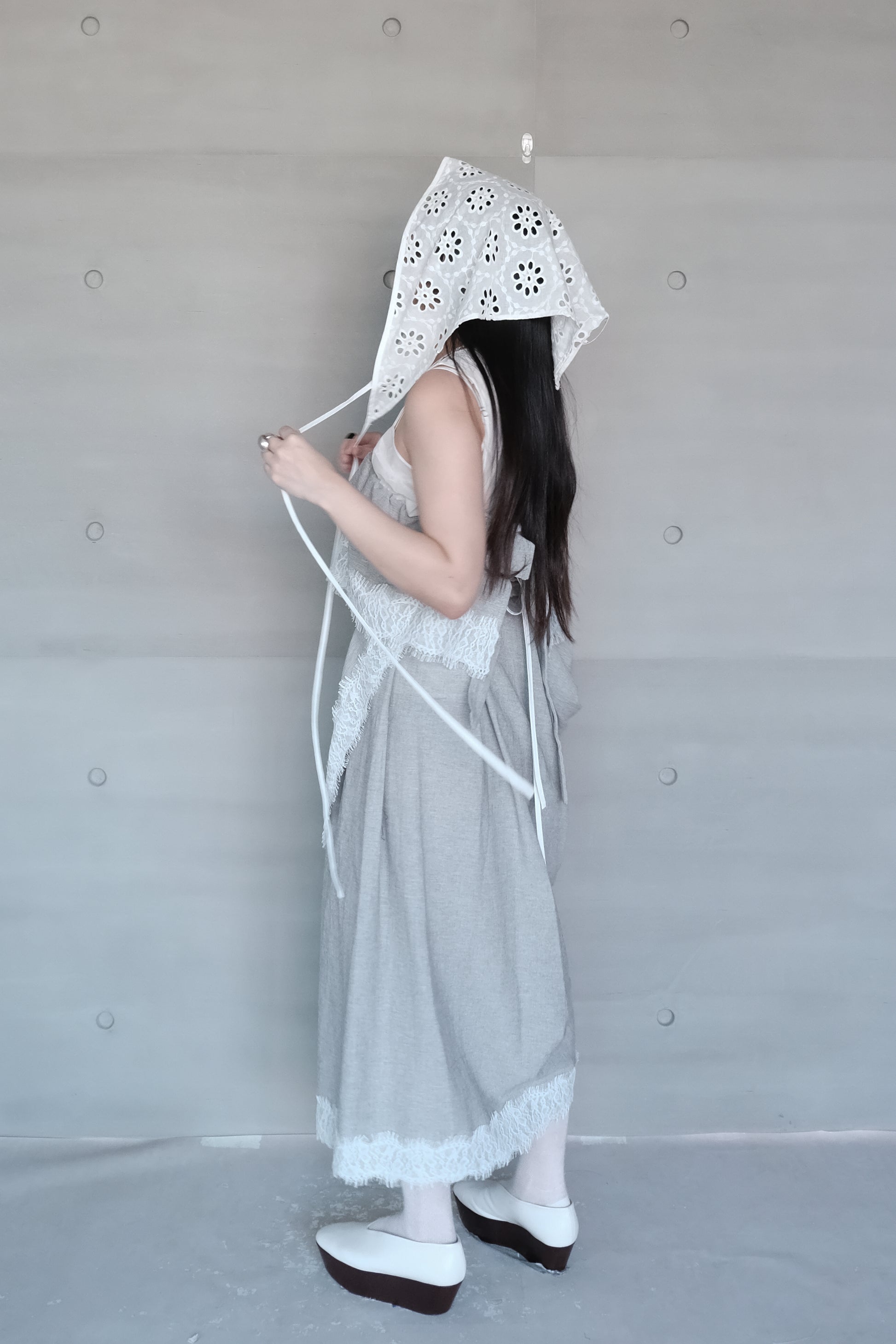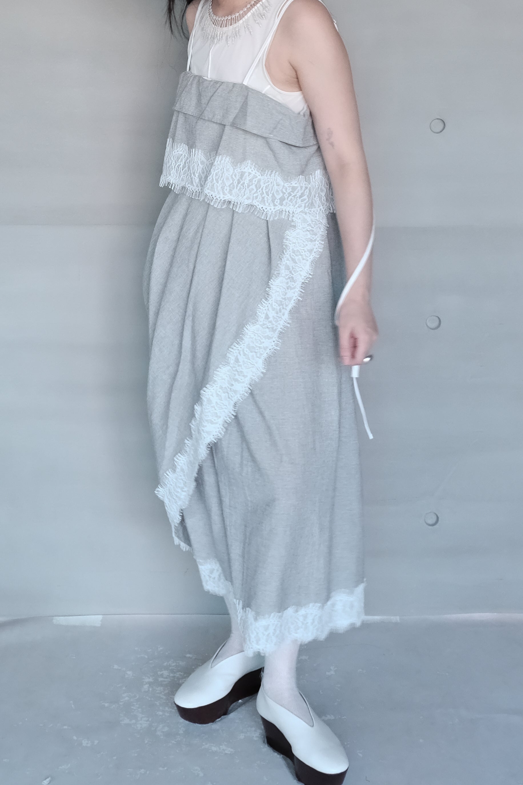 圍裹式綁帶裙,採用日本紙與棉混合而成的褶皺布料,側邊立裁羅馬式抓皺,透氣、輕柔、自然,澎袖剪裁,蕾絲飾邊,法式接縫細節。