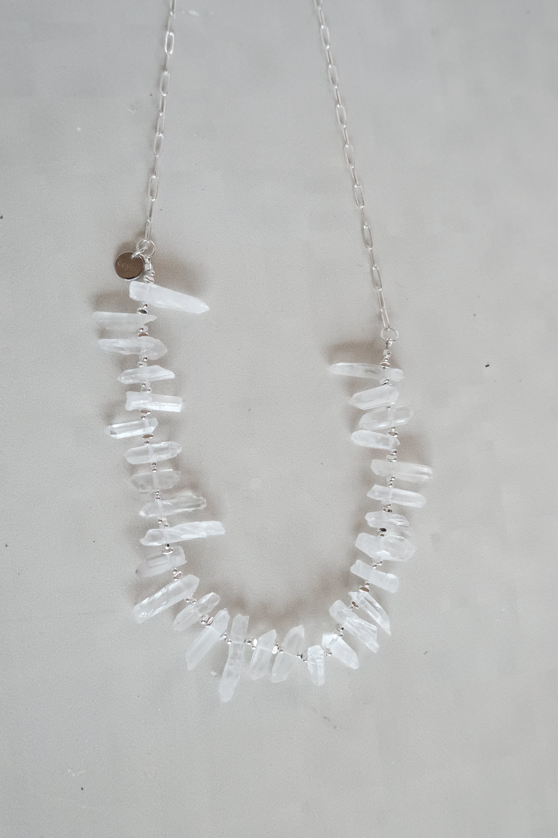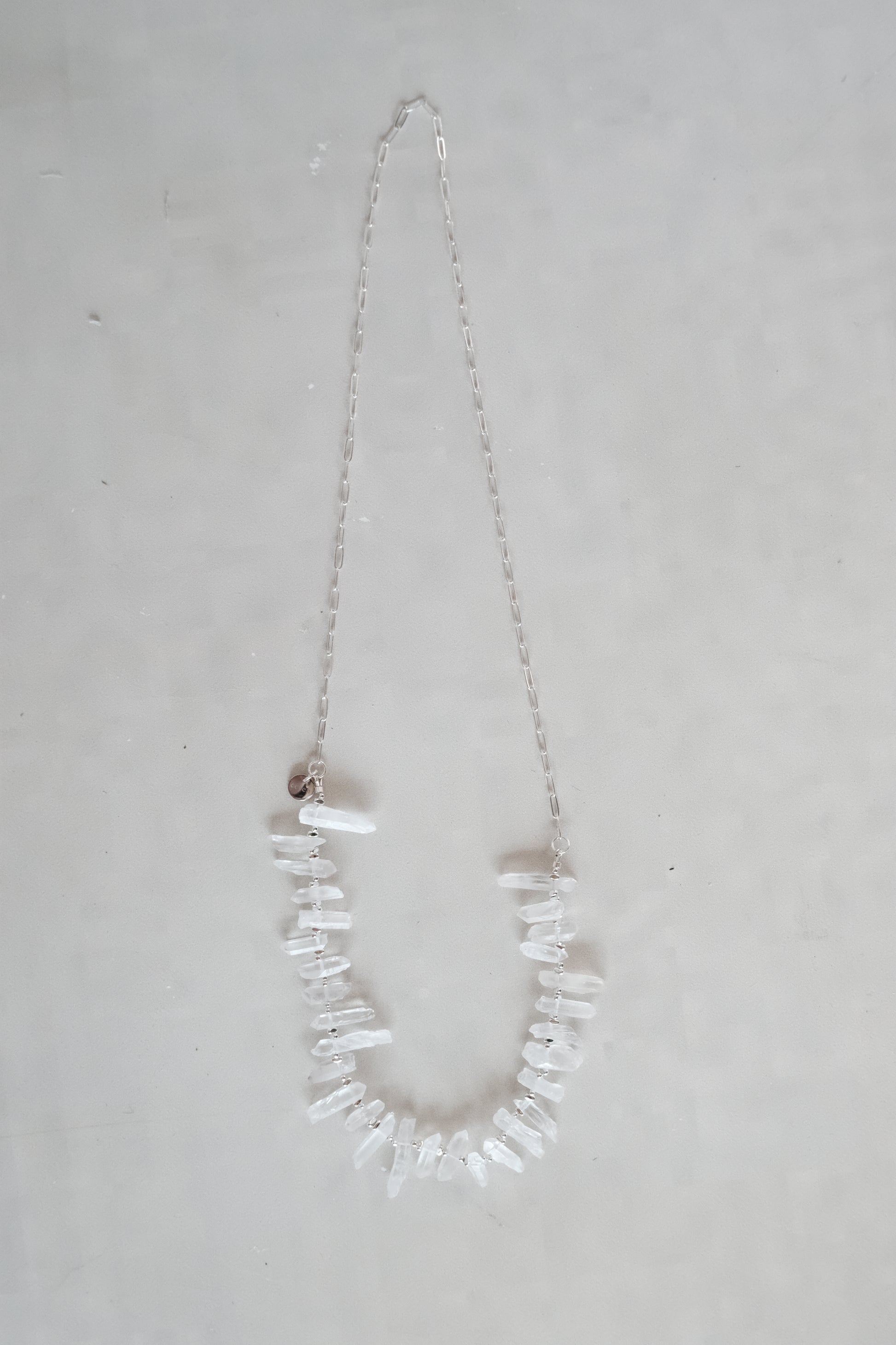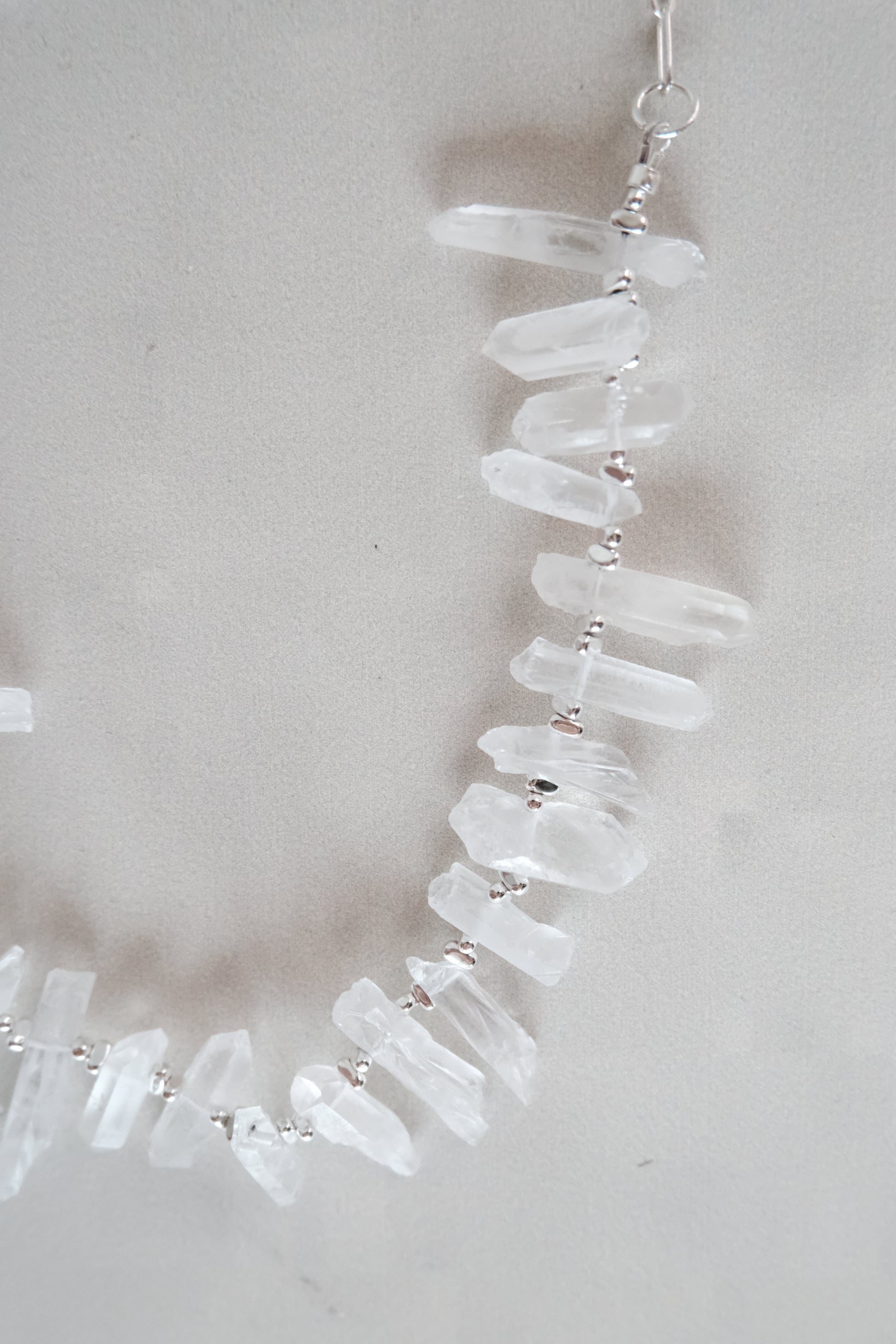 Featuring a natural clear quartz stone in its raw form, this long necklace highlights the crystal’s pure and organic beauty. Paired with a minimalist chain, it brings a subtle, uplifting energy to everyday styling. Clear quartz is known for clarity and balance, making this piece ideal for wearing alone or layering with other necklaces for a refined yet distinctive look.