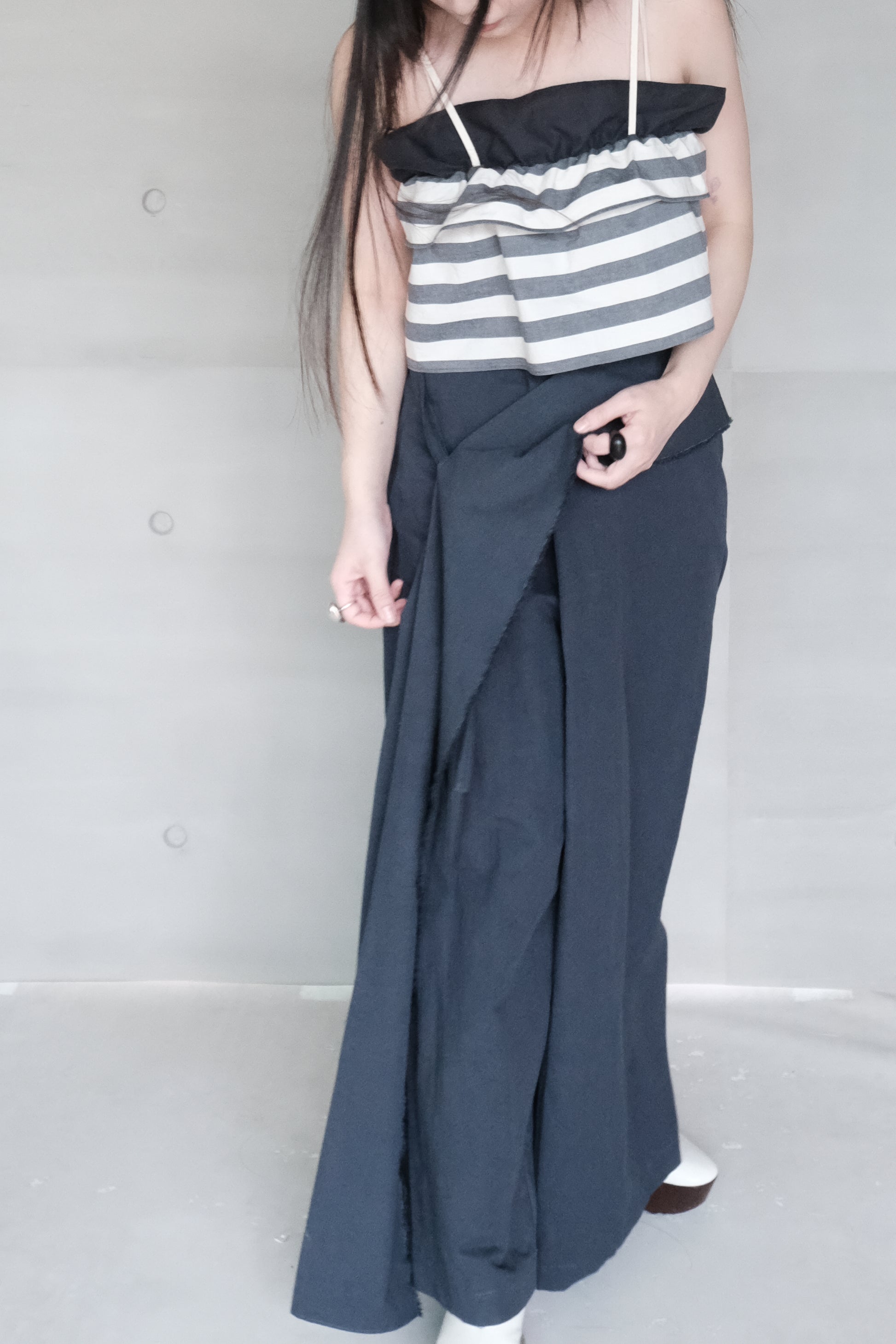 Crafted from a high-quality cotton-linen blend fabric sourced from Japan, these wide-leg pants offer a breathable and naturally textured feel. The bold pleats create a voluminous, relaxed silhouette that moves effortlessly with the body. Featuring a functional back pocket and a freely moving tie detail with a pendant accent, the design adds subtle motion and personality. Raw-edge finishing enhances its organic, laid-back aesthetic—an ideal piece that balances comfort with distinctive style.