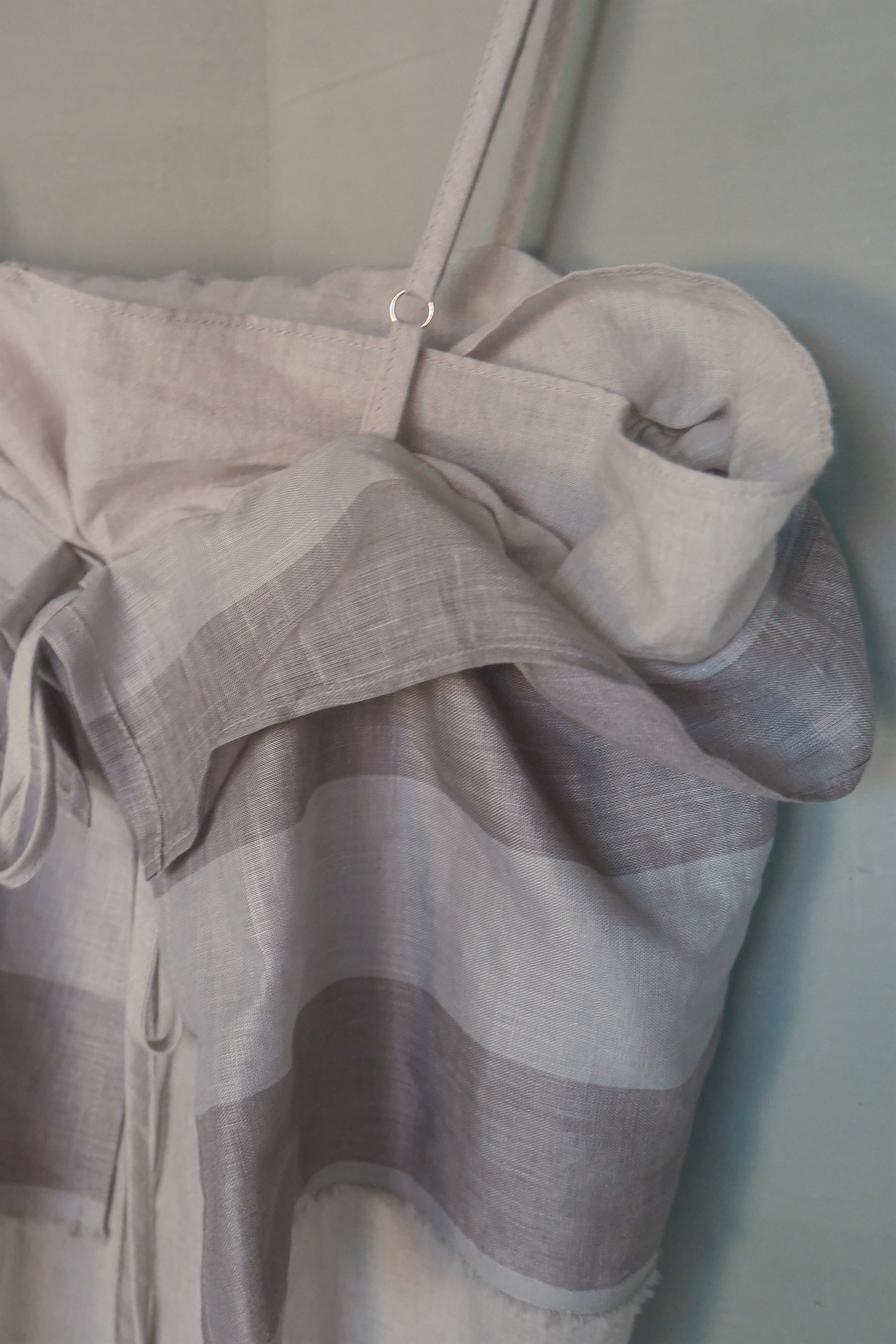 以工作室剩餘布料製作而成,延續布料生命並賦予新形式。雙層抽皺設計展現細緻層次感,小巧背心版型俐落簡潔。可依個人喜好調節,展現多種穿法,適合單穿或作為層次搭配。