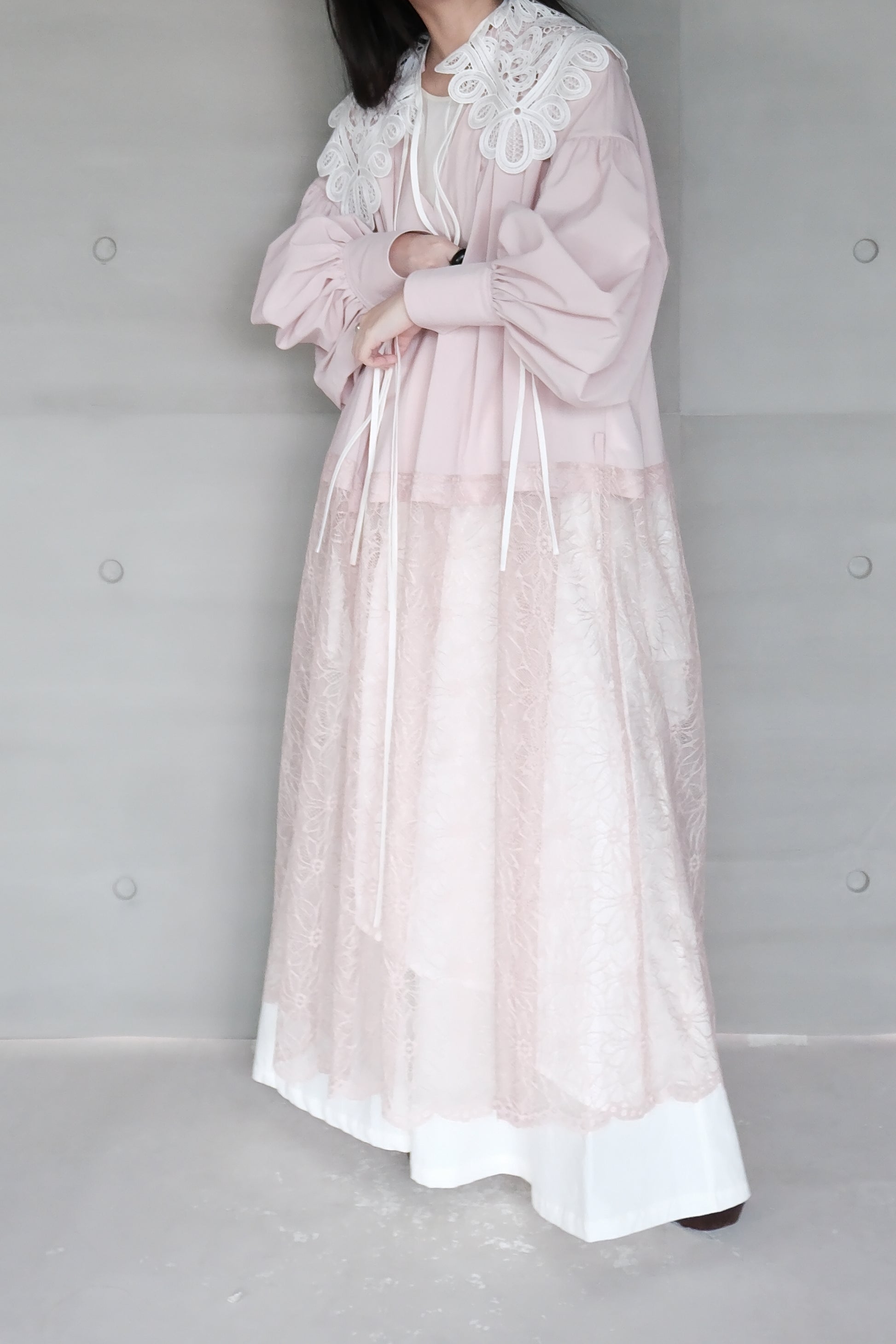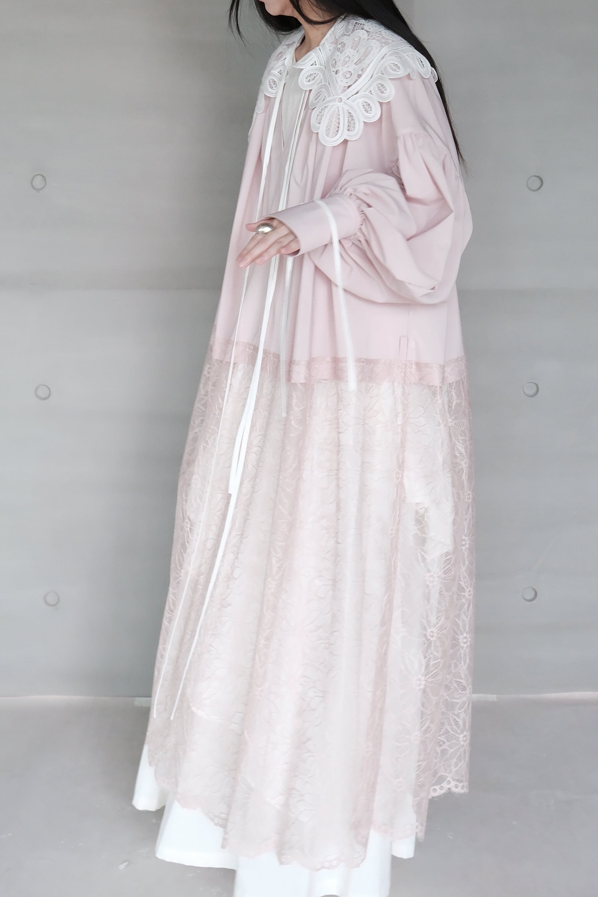 This light pink lace-panel dress is crafted from cool-touch cupro fabric made in Japan, offering a smooth texture and breathable comfort—perfect for spring and summer. Featuring long puff sleeves and delicate white ribbon accents, the relaxed silhouette ensures effortless wearability. The hem is adorned with lace panels, adding a romantic touch and layered elegance to this softly feminine, thoughtfully designed piece.