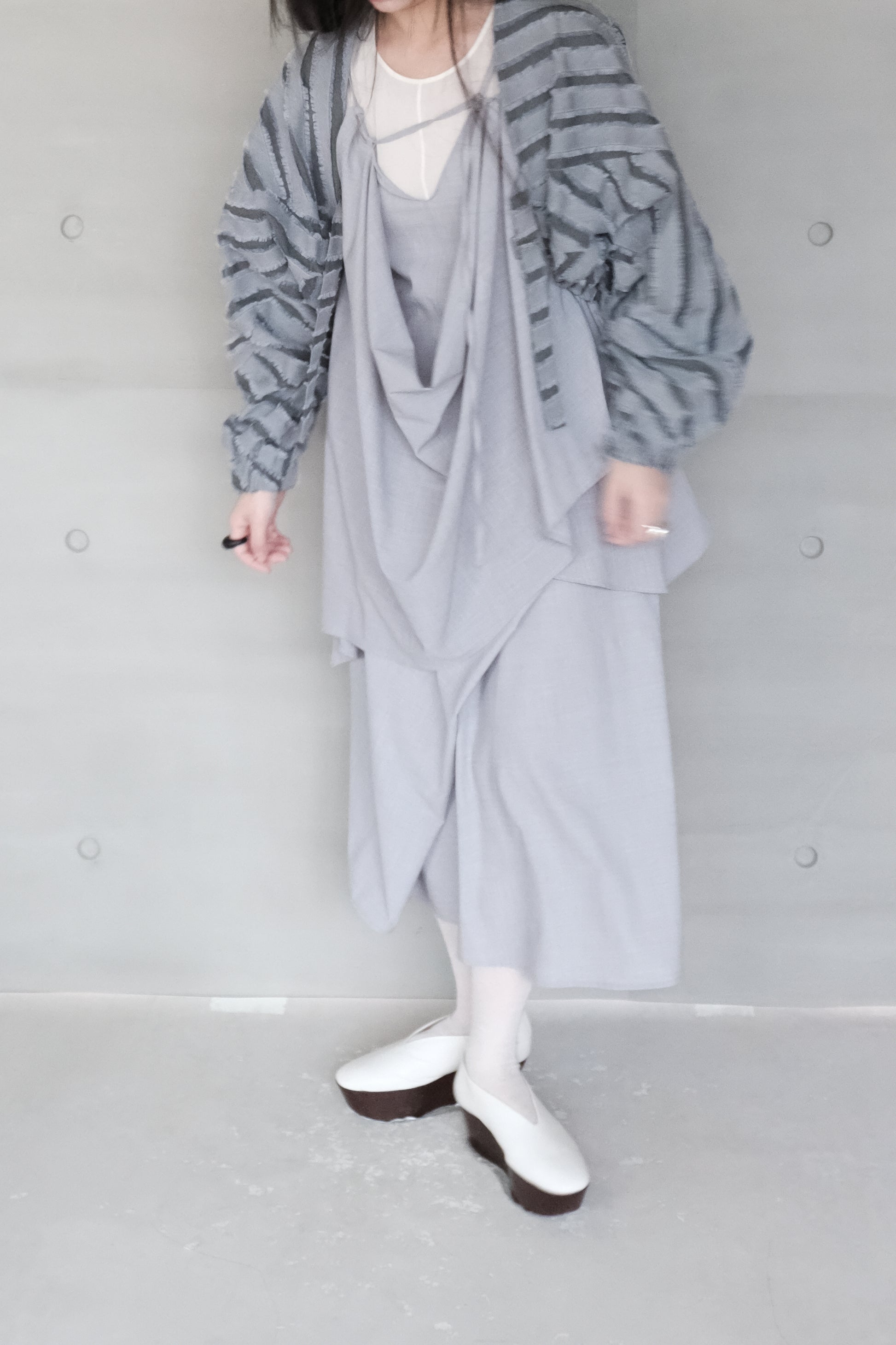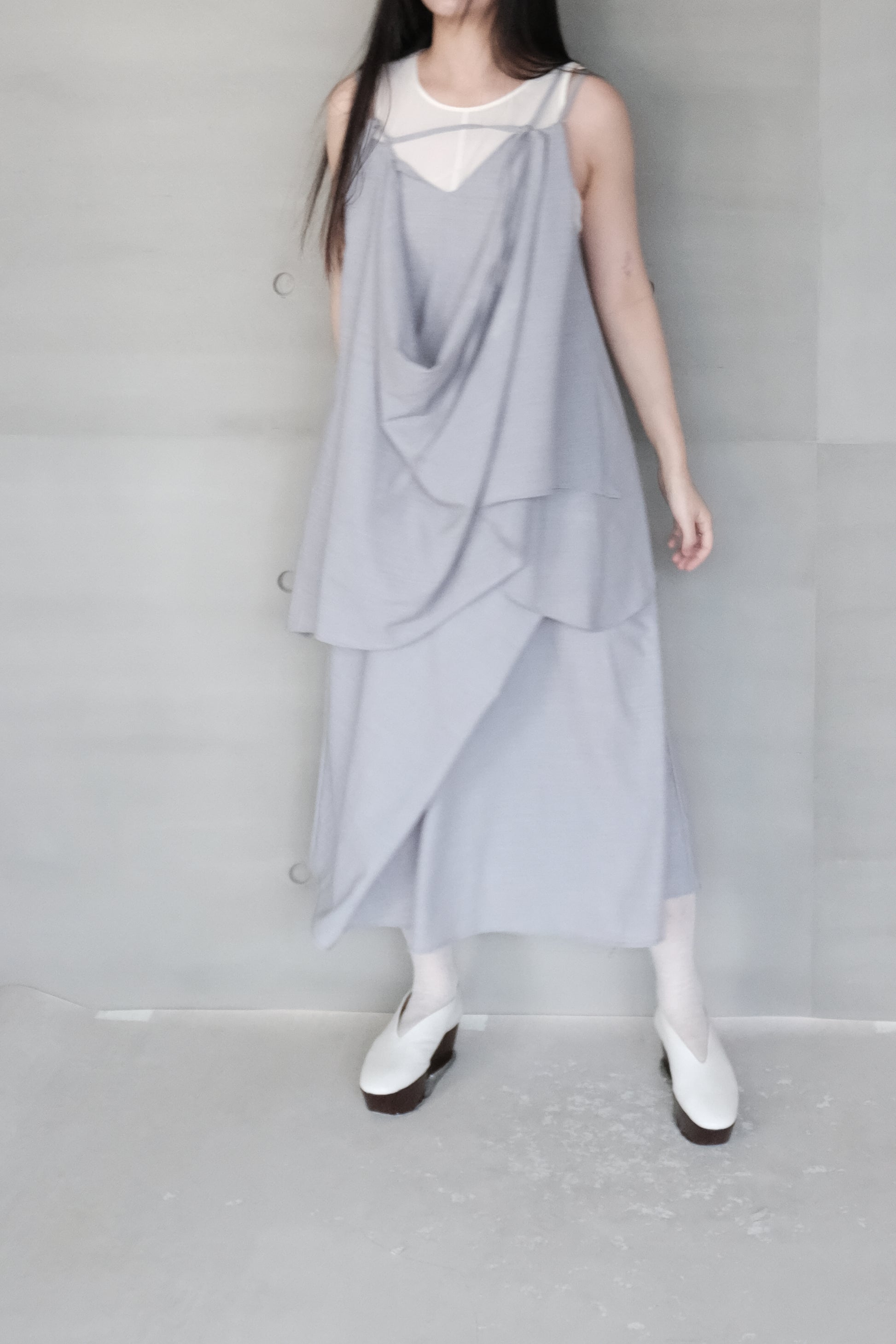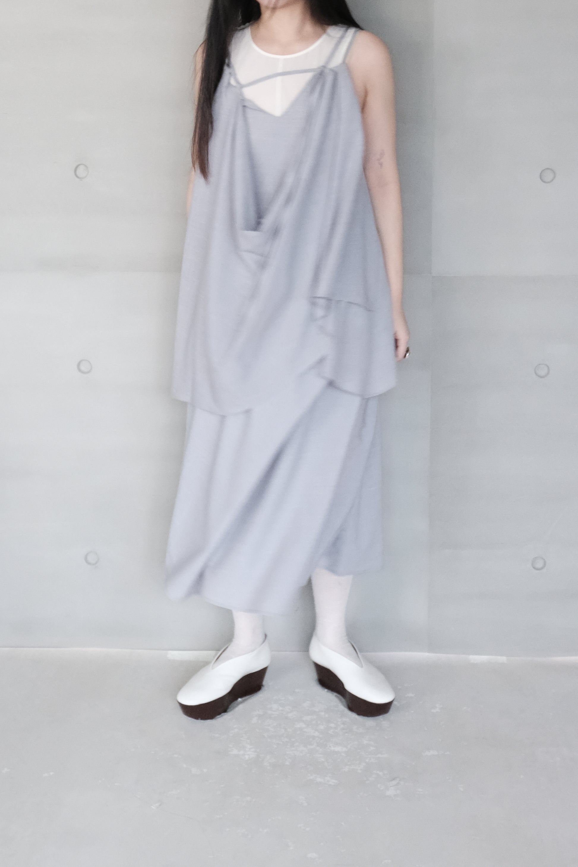 選用來自日本的親膚布料,前片垂墜雙層設計,隨風擺動,肩帶可調節式以呈現不對稱剪裁效果。