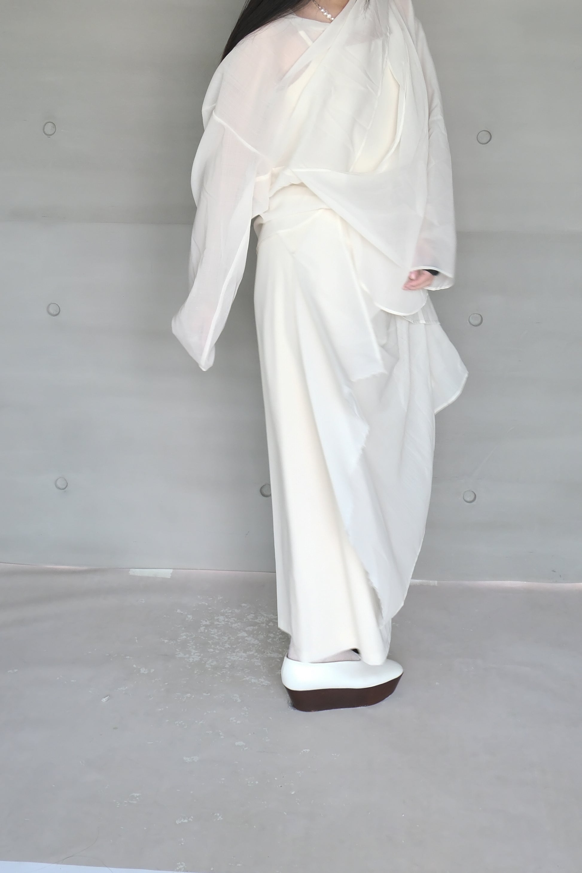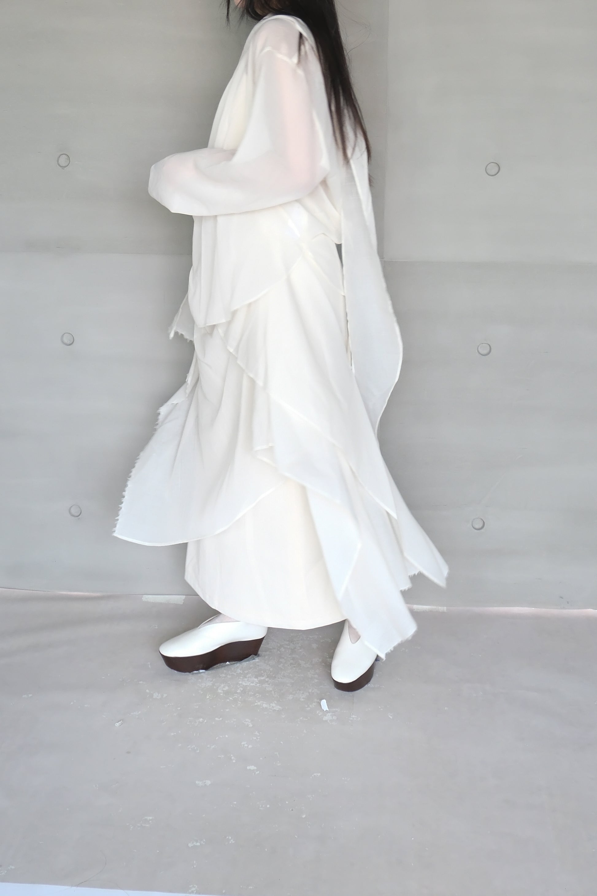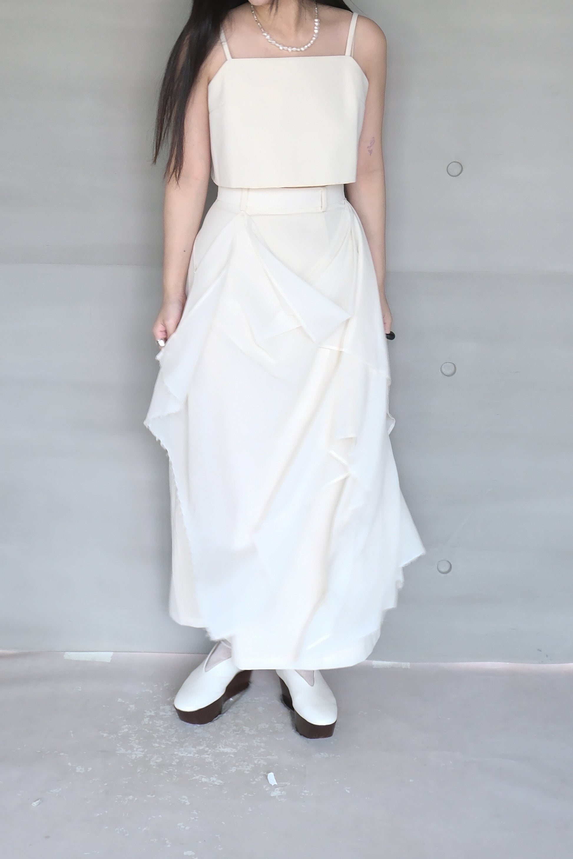 Crafted from a Japanese wool-polyester blend, this straight skirt features a structured yet soft texture that offers both warmth and comfort. The clean straight-cut silhouette flatters the figure, creating an elegant, streamlined look. A distinctive draped tie detail at the front allows for adjustable styling, adding versatility and visual interest. Lightweight and easy to wear, this skirt blends functionality with modern design—perfect for effortless everyday styling.