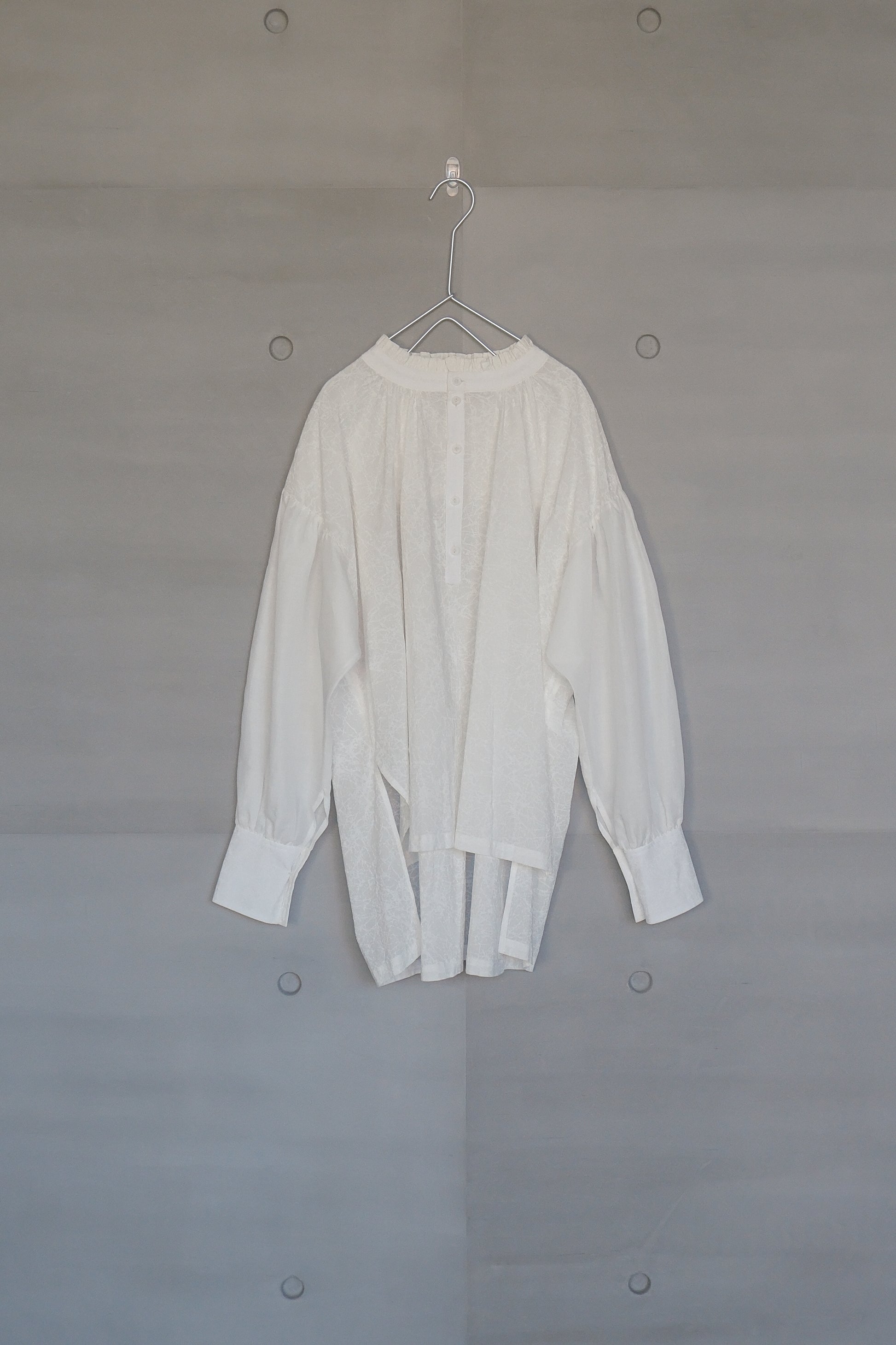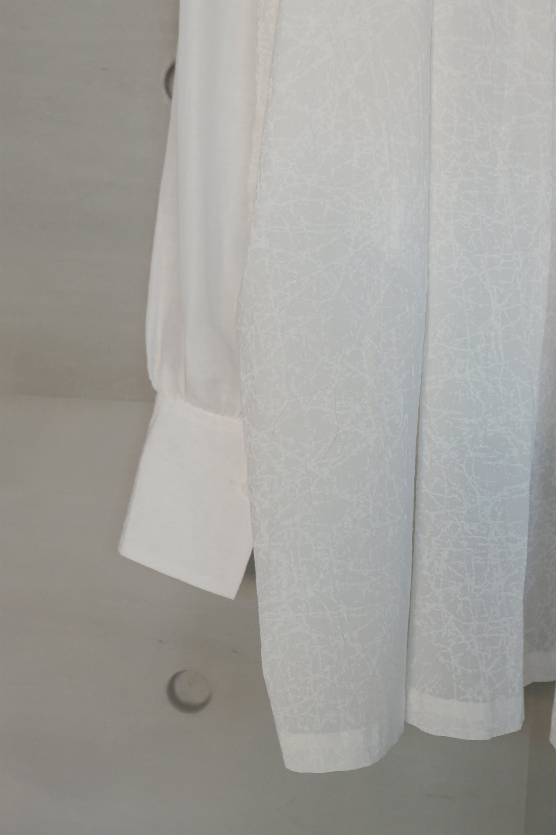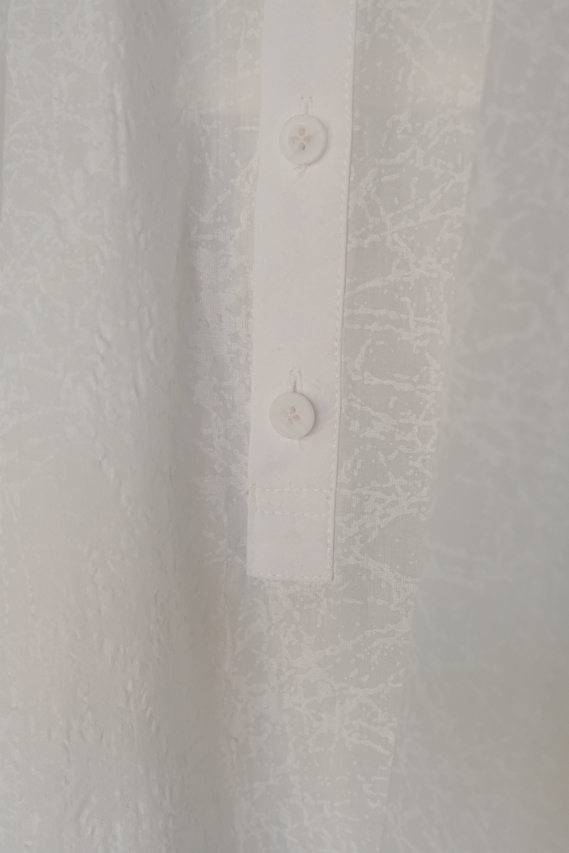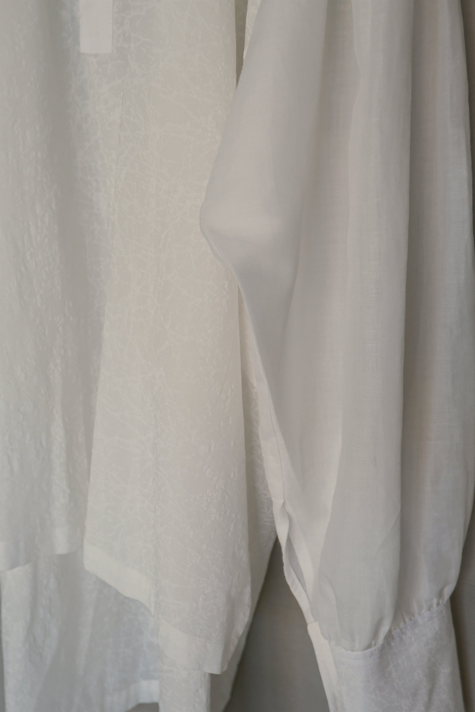 This off-white blouse features a refined combination of ink-splashed cotton and sheer linen panels, offering both texture and breathability. The cuffs are detailed with transparent linen inserts, lending an airy feel. A half placket adds a subtle vintage charm, while the ruffled collar with gentle gathers frames the neckline in a soft, romantic silhouette.