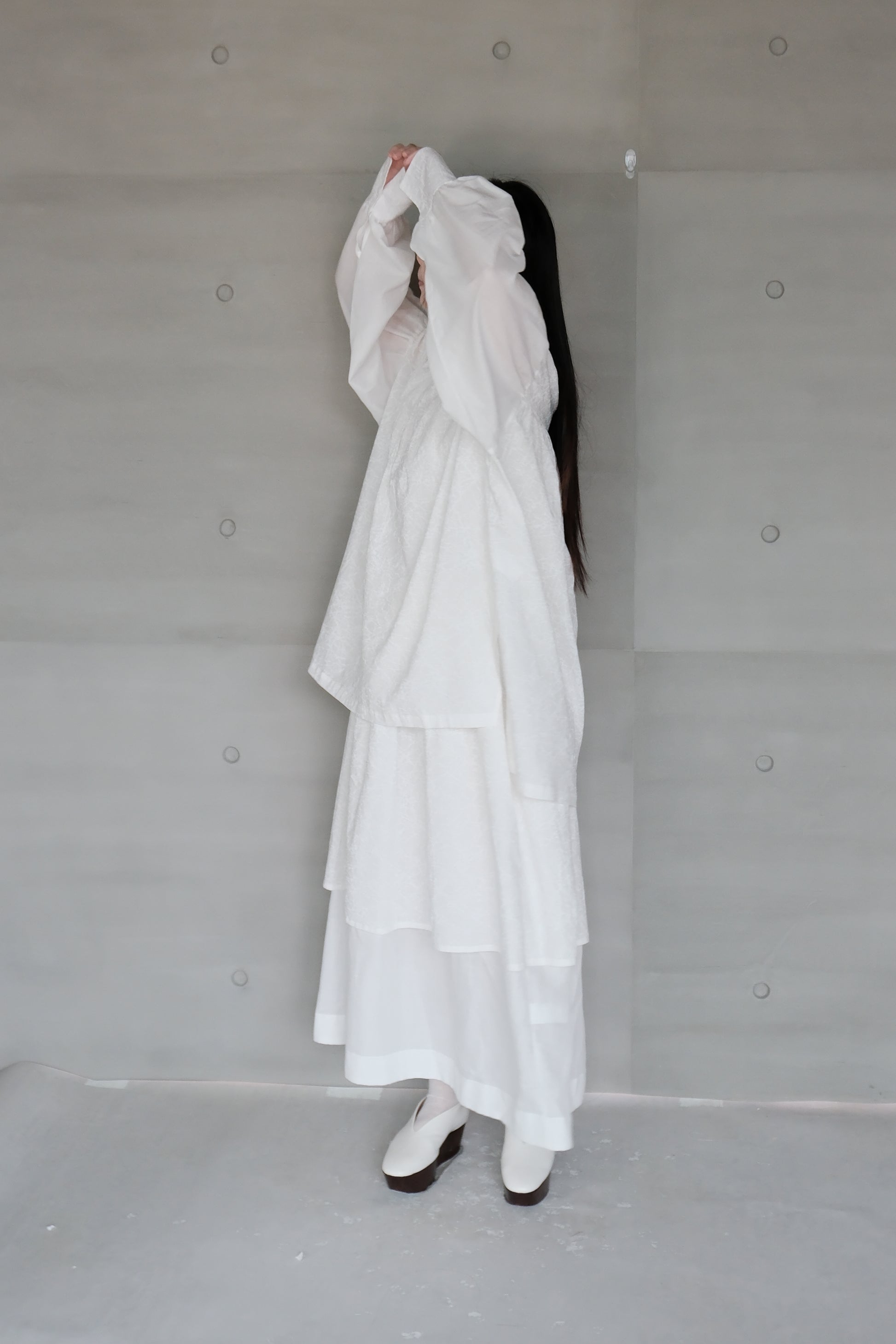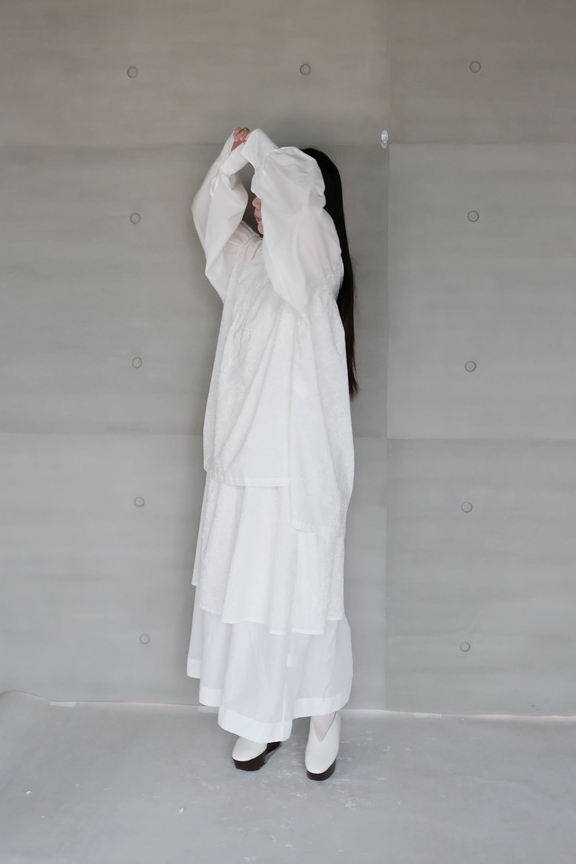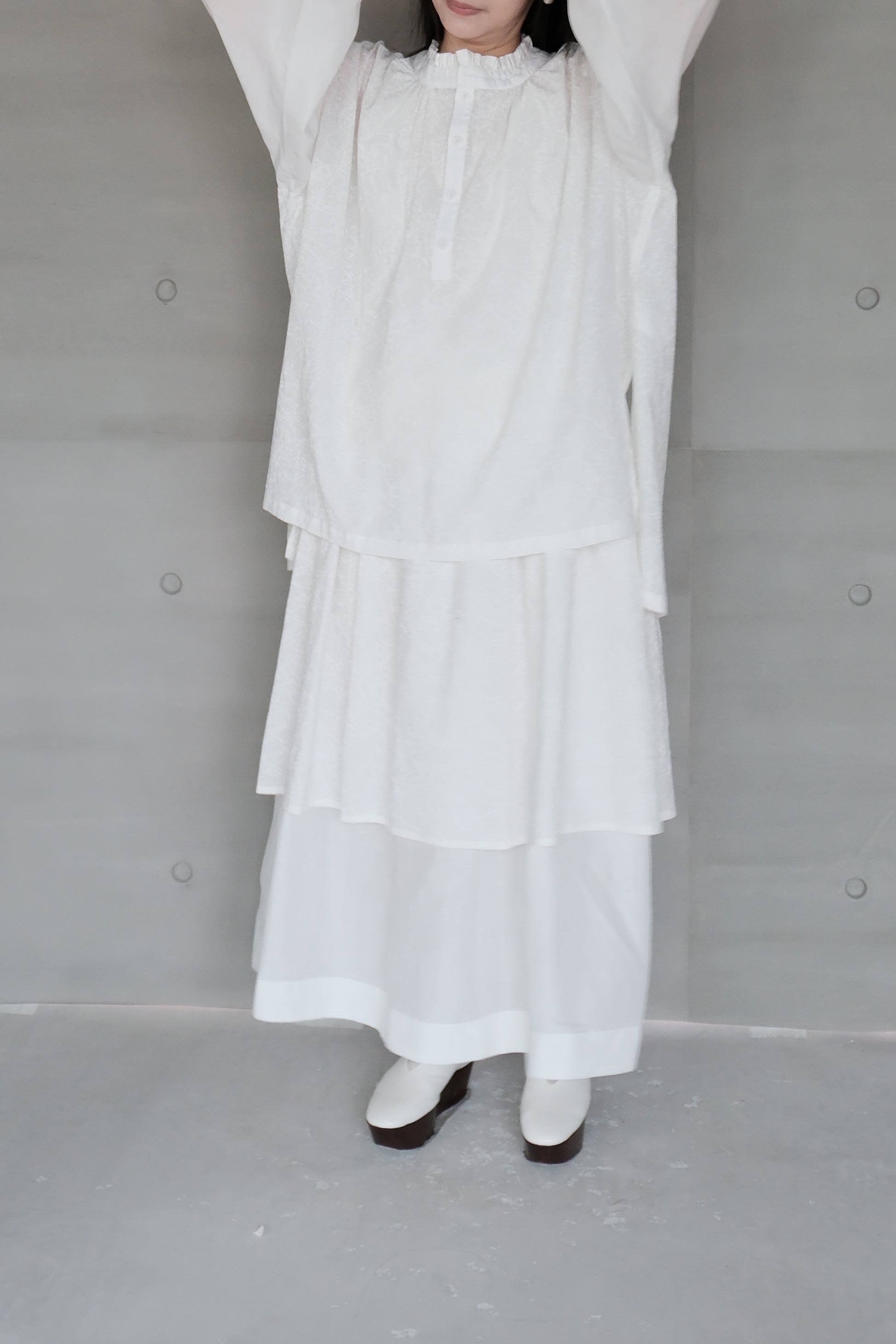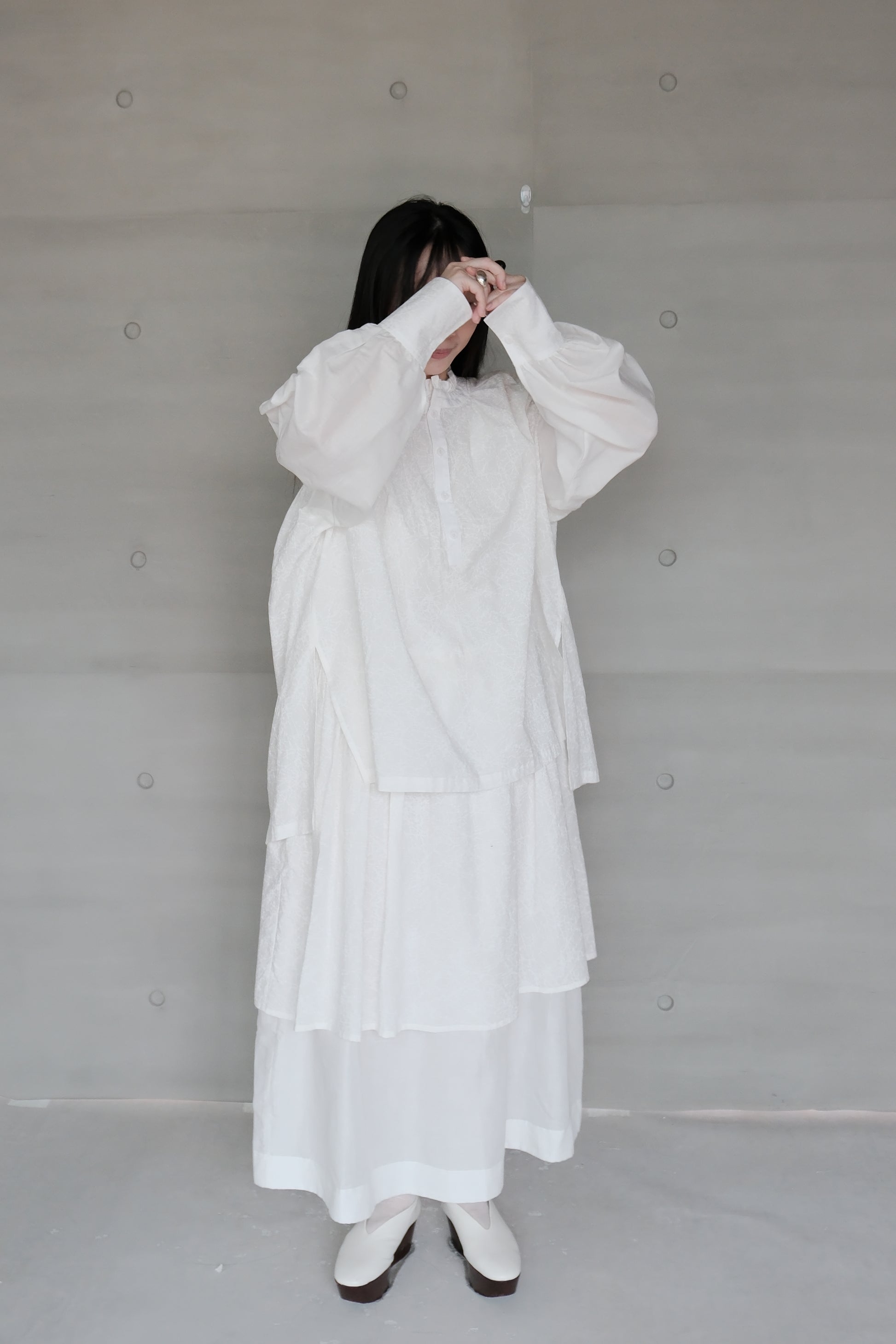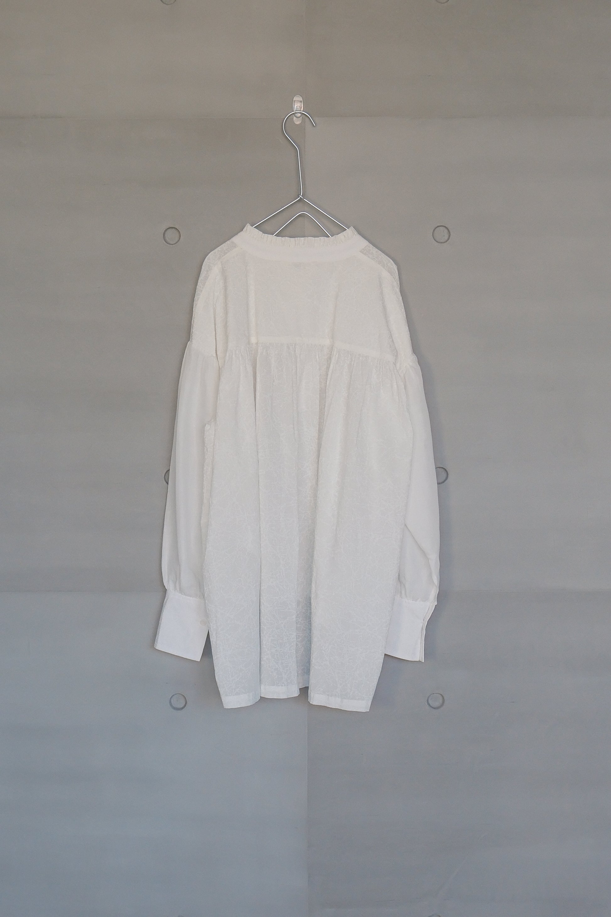 This off-white blouse features a refined combination of ink-splashed cotton and sheer linen panels, offering both texture and breathability. The cuffs are detailed with transparent linen inserts, lending an airy feel. A half placket adds a subtle vintage charm, while the ruffled collar with gentle gathers frames the neckline in a soft, romantic silhouette.