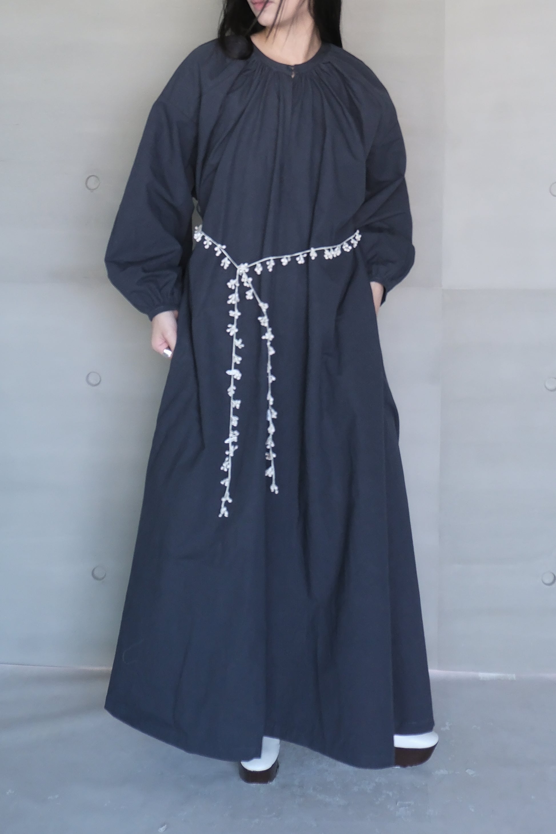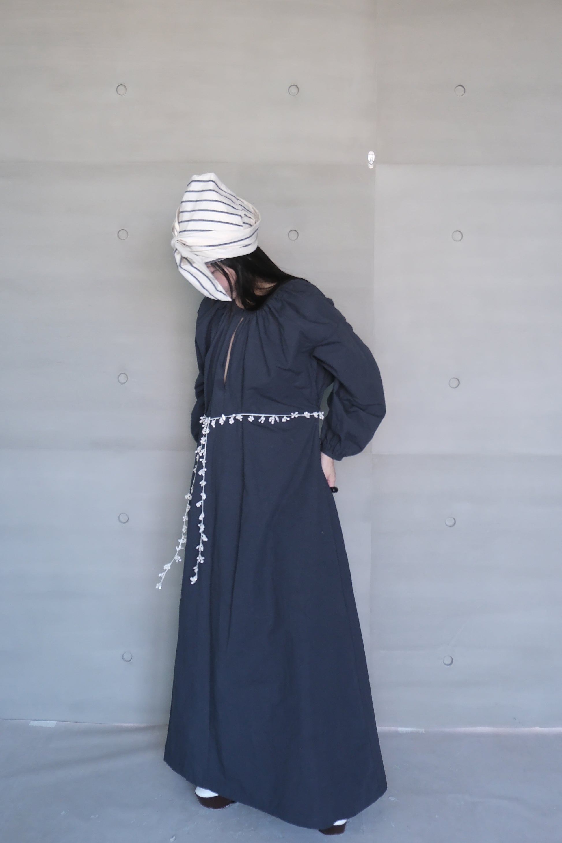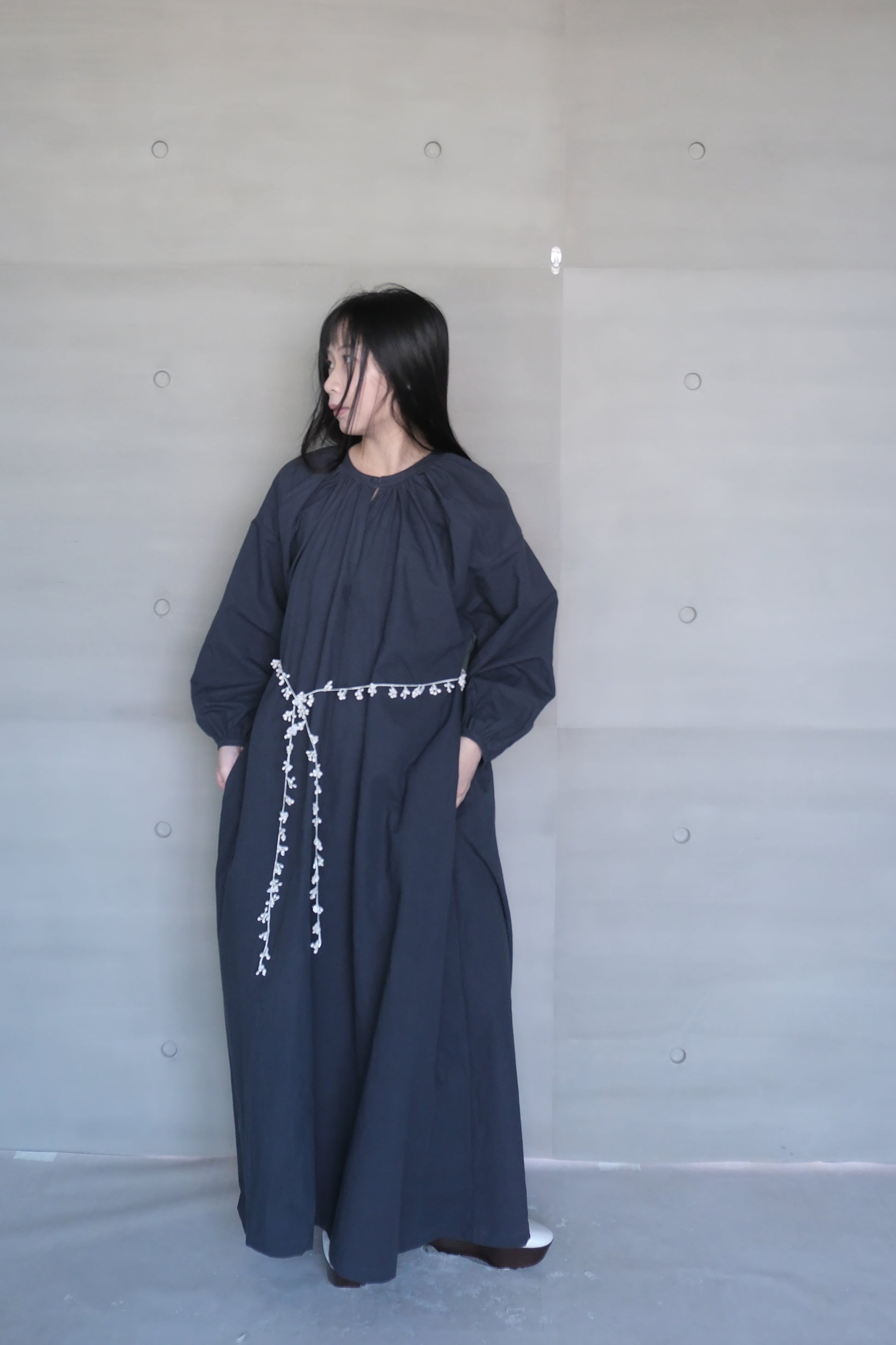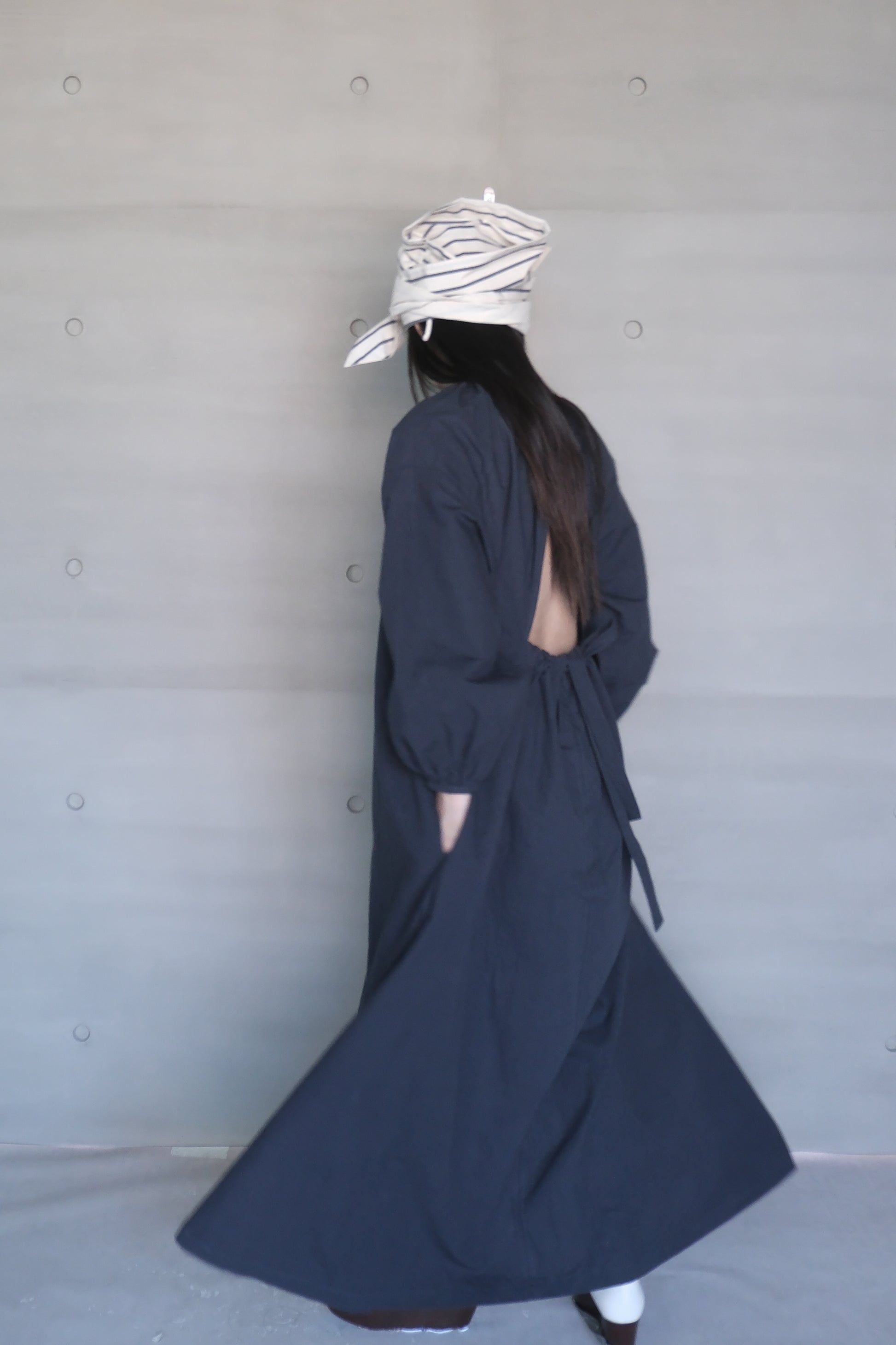 Crafted from Japanese washed cotton-linen fabric, this dress features a naturally textured surface with a subtle vintage appeal. The deep navy hue adds a sense of quiet sophistication, while the long sleeves balance out the striking open-back cut for a look that feels both bold and graceful. An adjustable tie at the lower back allows for a customized fit and subtle waist definition. With side pockets for added practicality, this piece blends everyday comfort with effortlessly elegant design—perfect for seasonal transitions or layered styling.