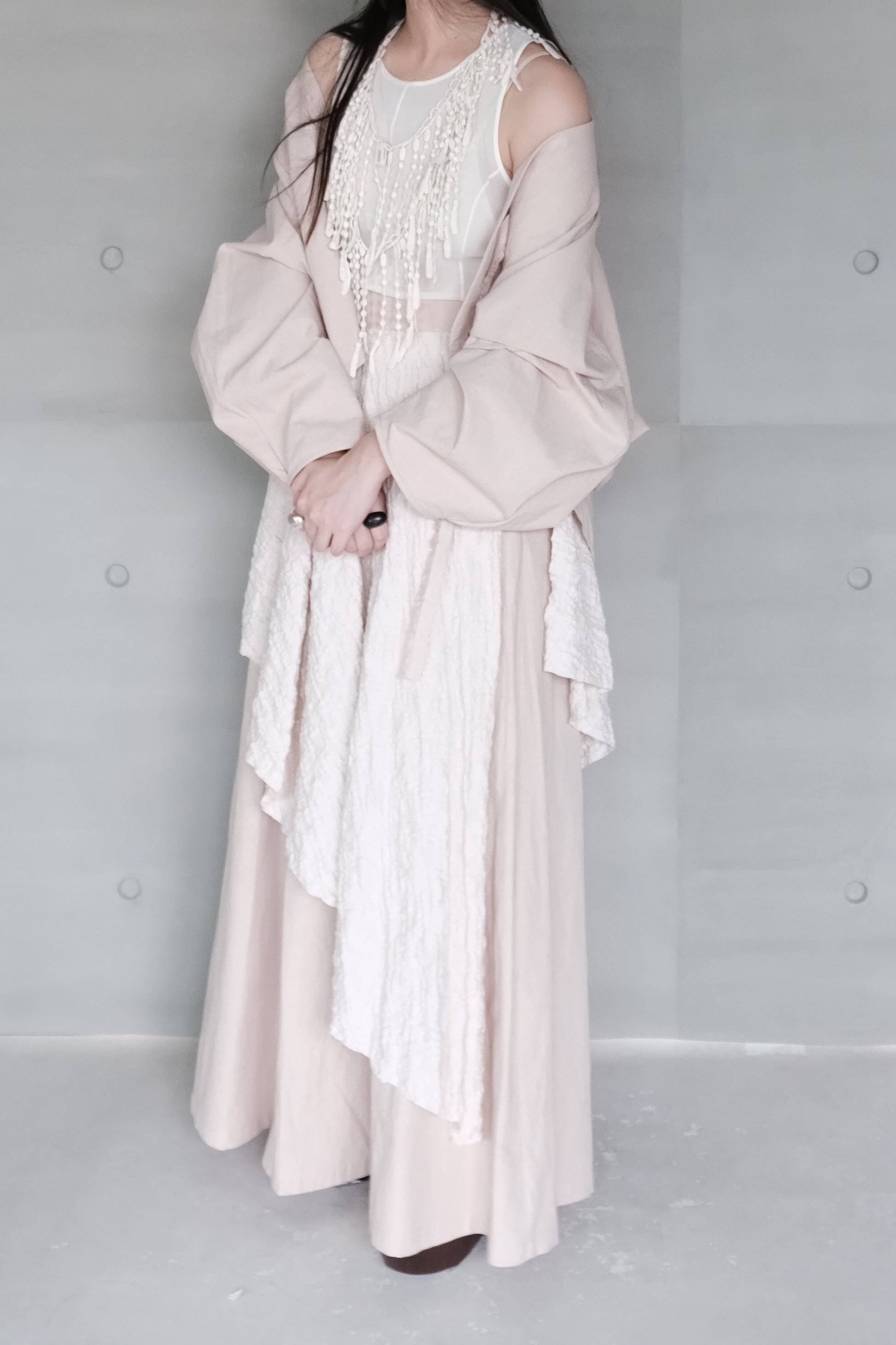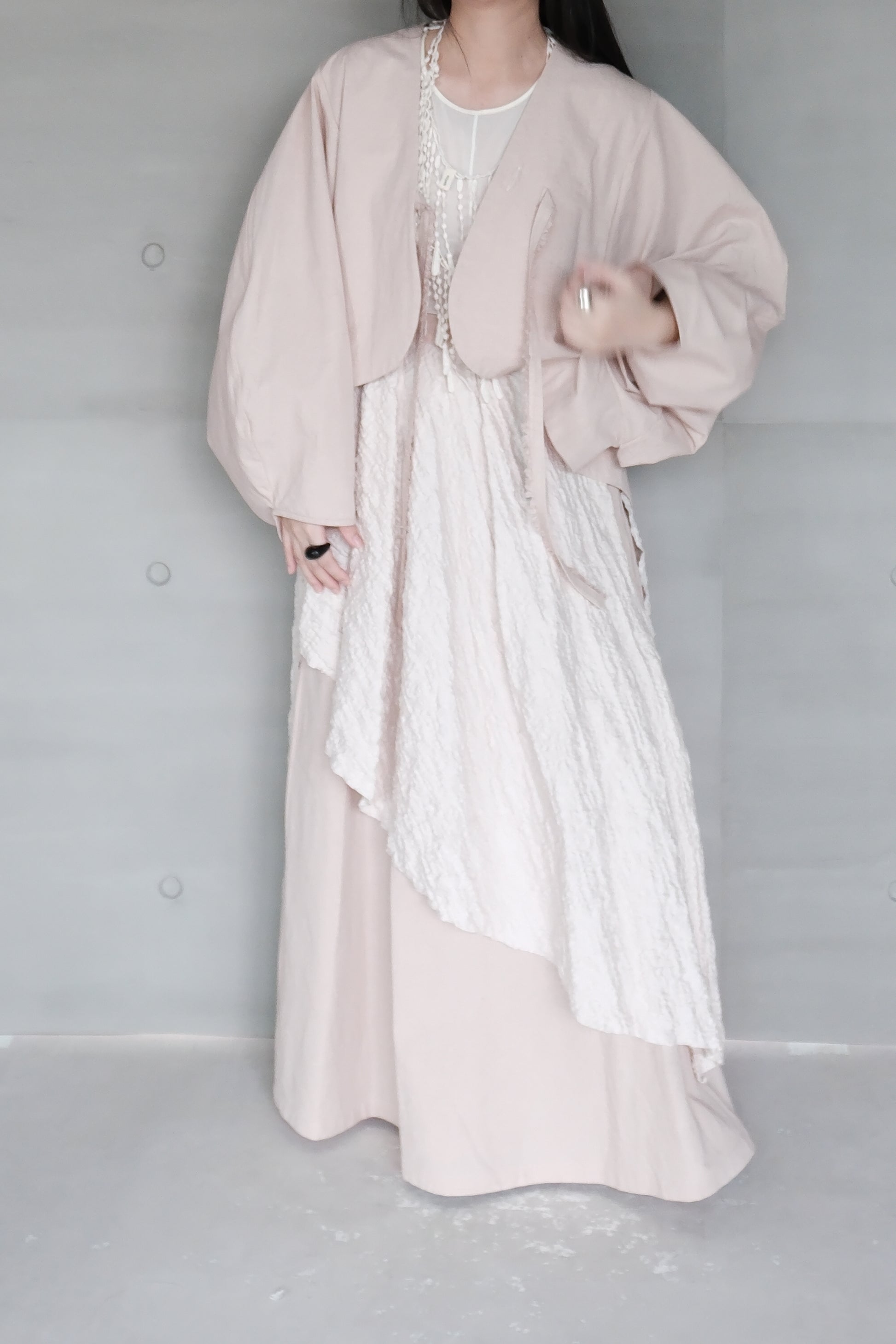 這款外套選用來自日本的做舊感棉麻布料,霧粉色調,布面自然紋理結合低調復古氛圍,展現洗鍊而有質感的生活美學。大連袖設計勾勒出寬鬆舒適的輪廓,搭配優雅的弧形剪裁與毛邊綁帶,可依造型自由調整穿法,無論隨性披搭或綁結穿著,都能展現不同風格與層次。