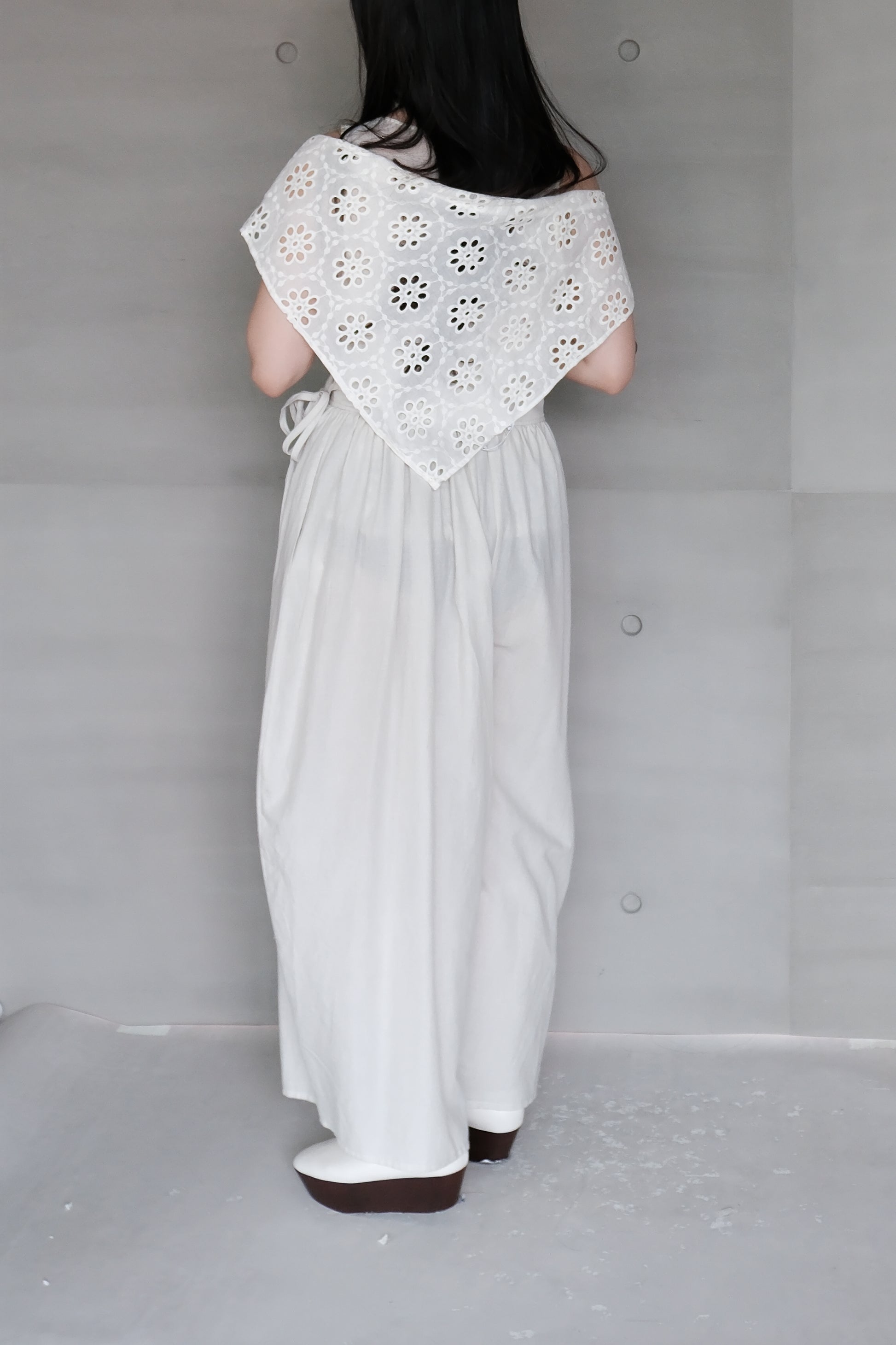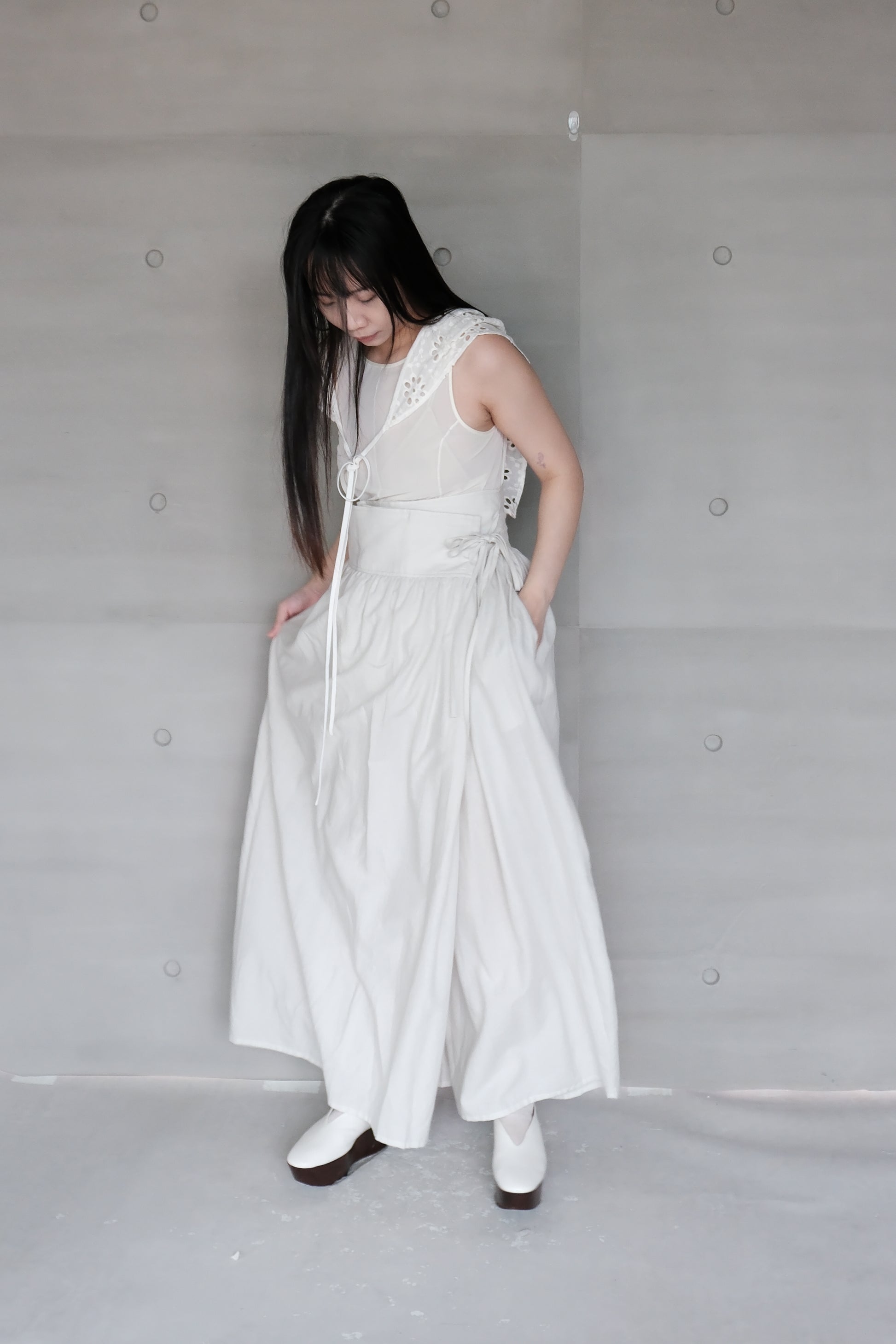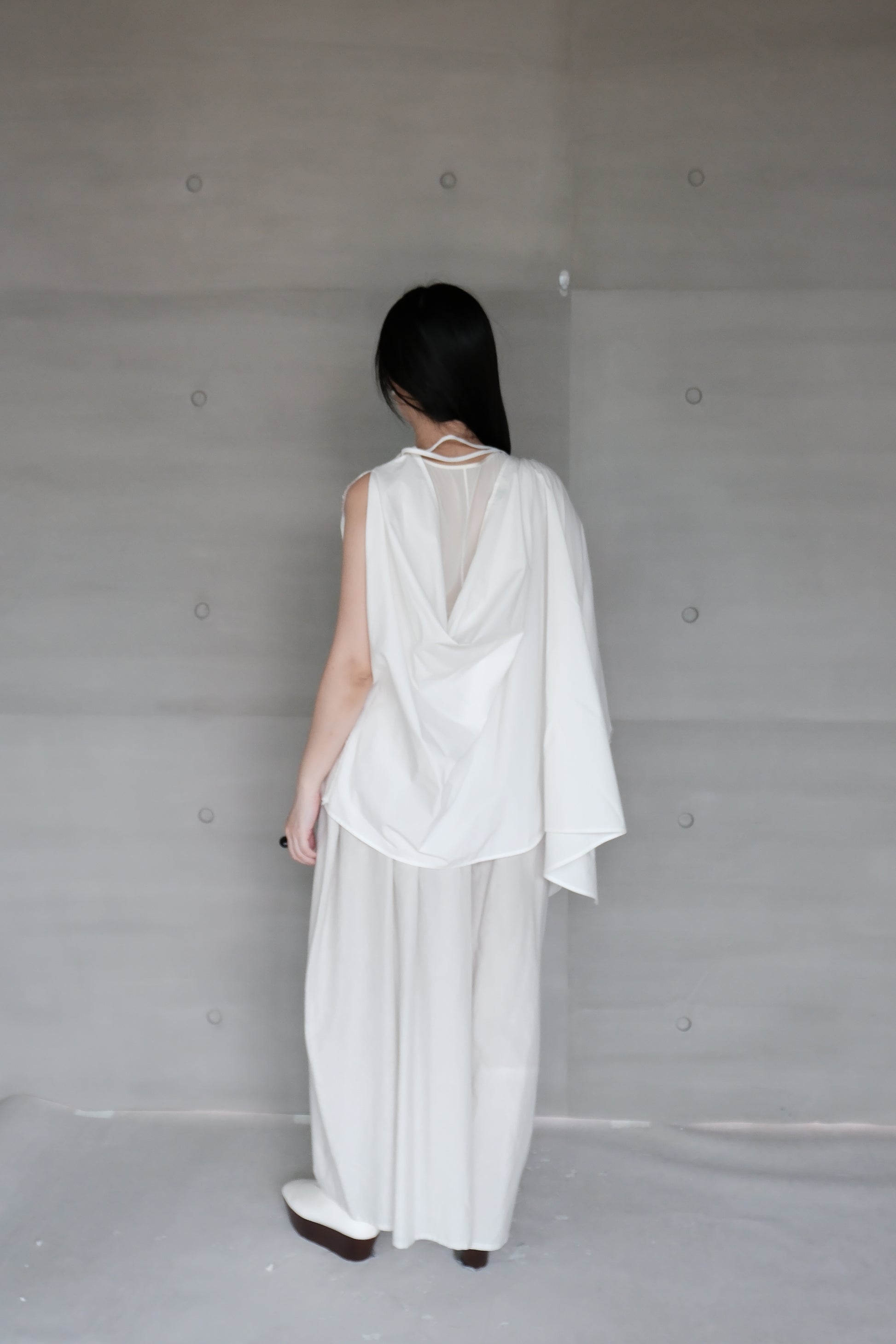 Crafted from organic cotton naturally dyed with red turnip by a Japanese mill, this fabric carries a soft and nuanced hue. The wide-leg silhouette features asymmetric pleated details, creating a layered and sculptural effect. The waist is secured with an inner buckle, while an oversized pleated wrap tie defines the outer layer, balancing structure with fluidity.
