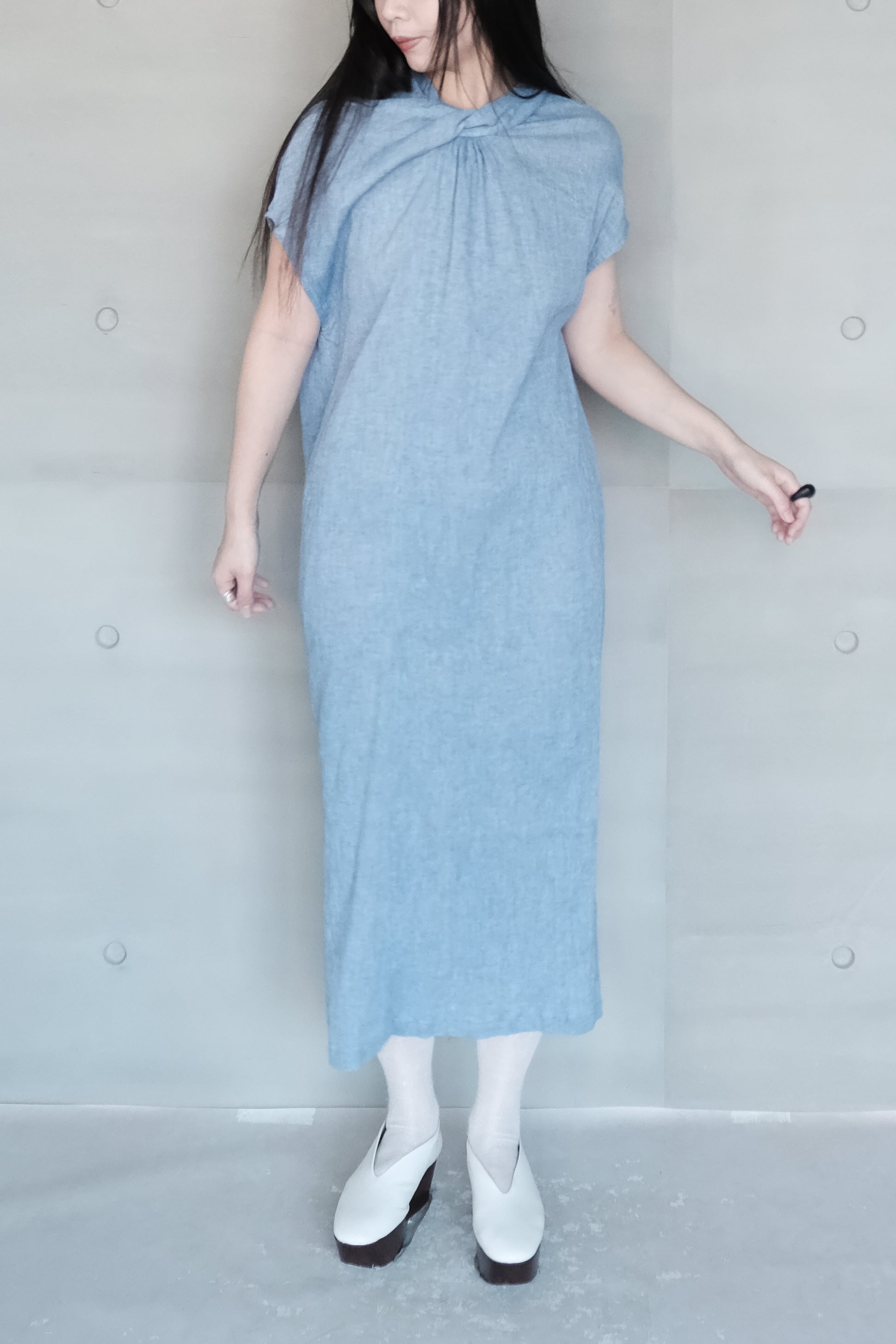 This dress showcases a beautifully crafted twisted-knot neckline, complemented by meticulous details such as expertly finished French seams and delicate, understated pleating. These thoughtful elements come together to create a silhouette that seamlessly blends timeless elegance with a modern, sophisticated edge.