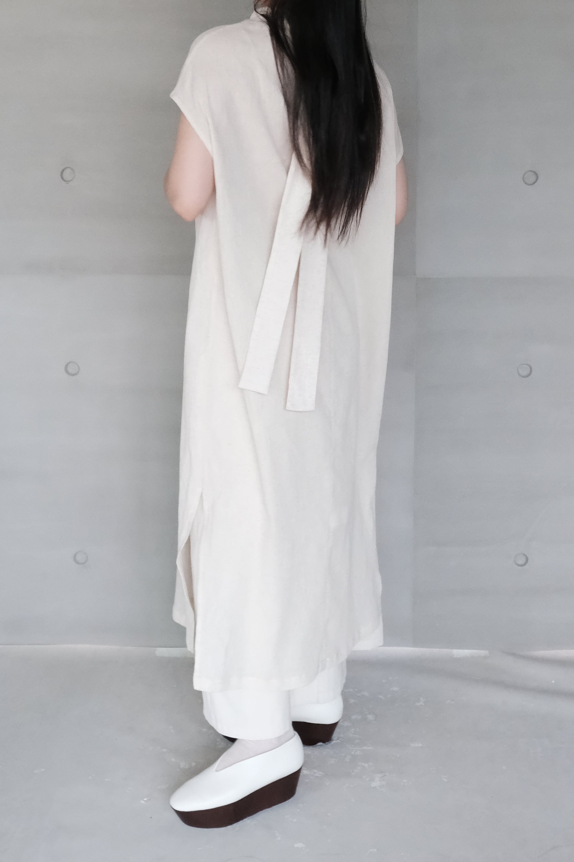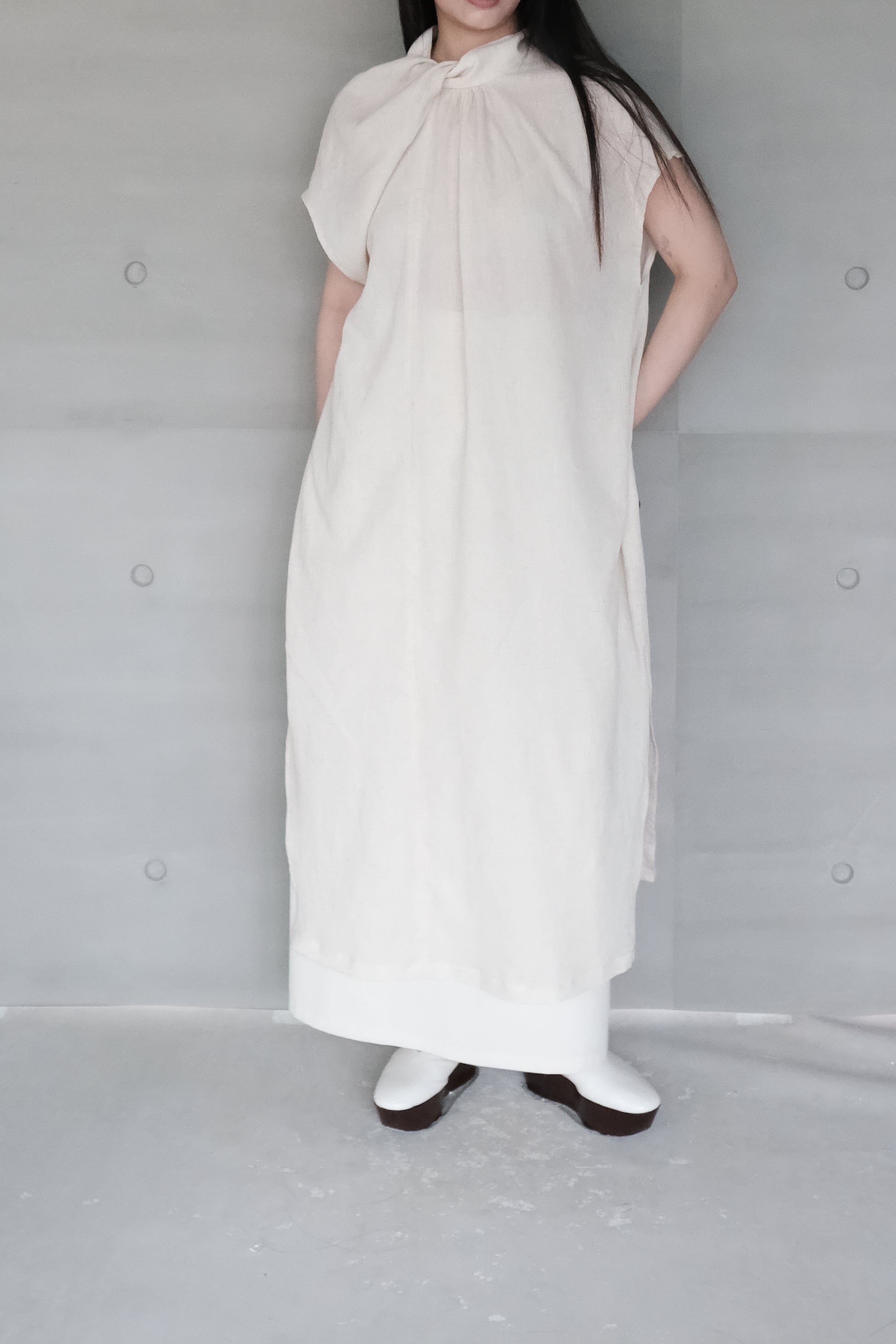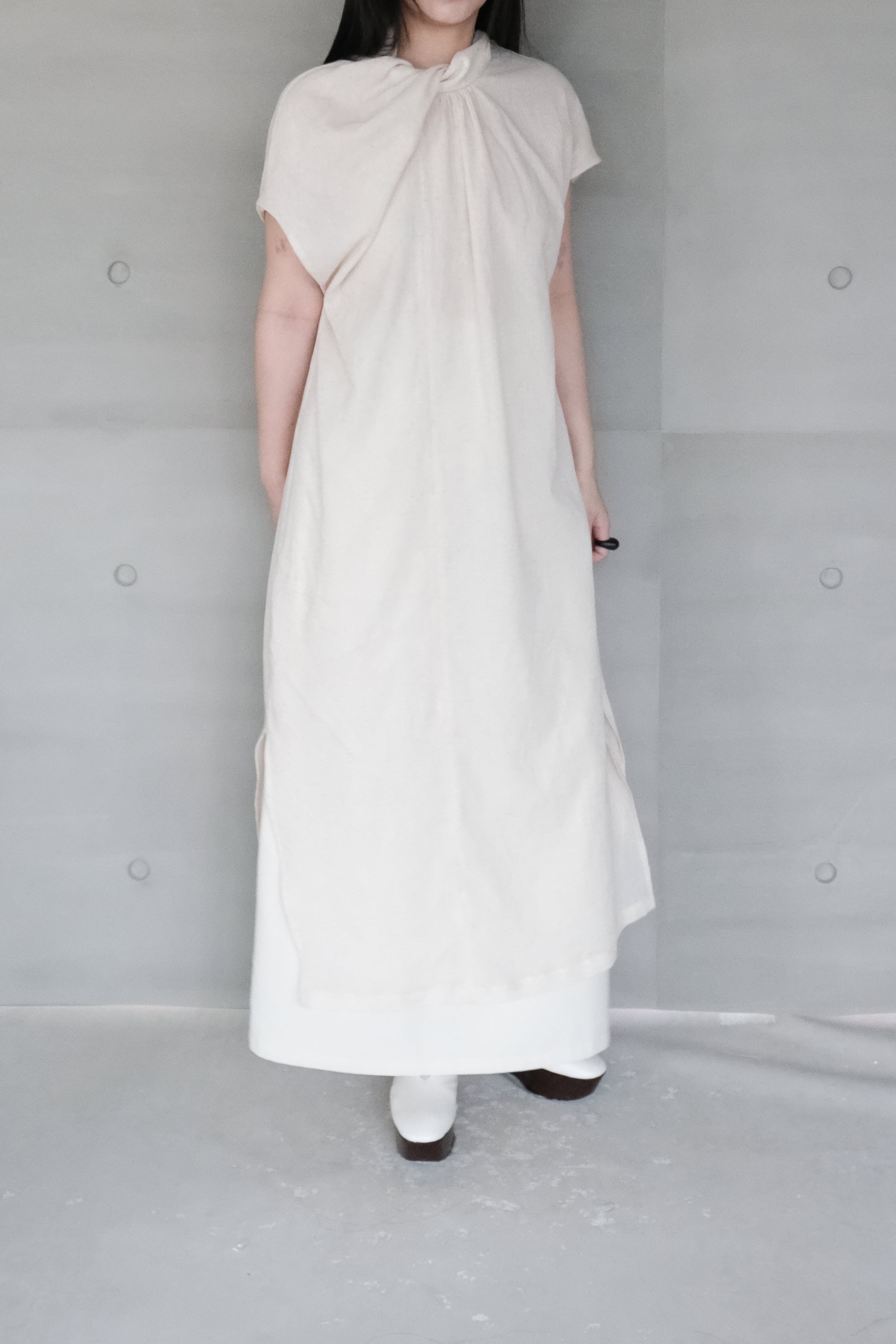 This dress showcases a beautifully crafted twisted-knot neckline, complemented by meticulous details such as expertly finished French seams and delicate, understated pleating. These thoughtful elements come together to create a silhouette that seamlessly blends timeless elegance with a modern, sophisticated edge.