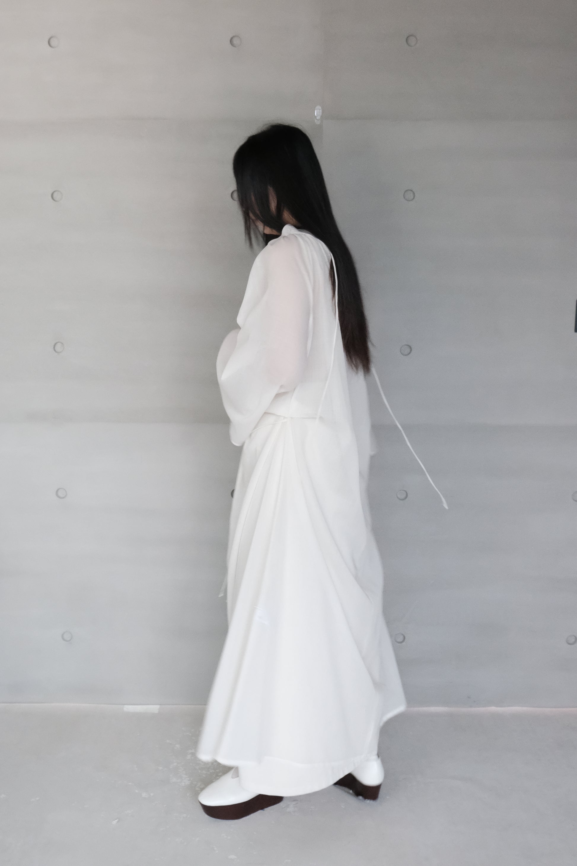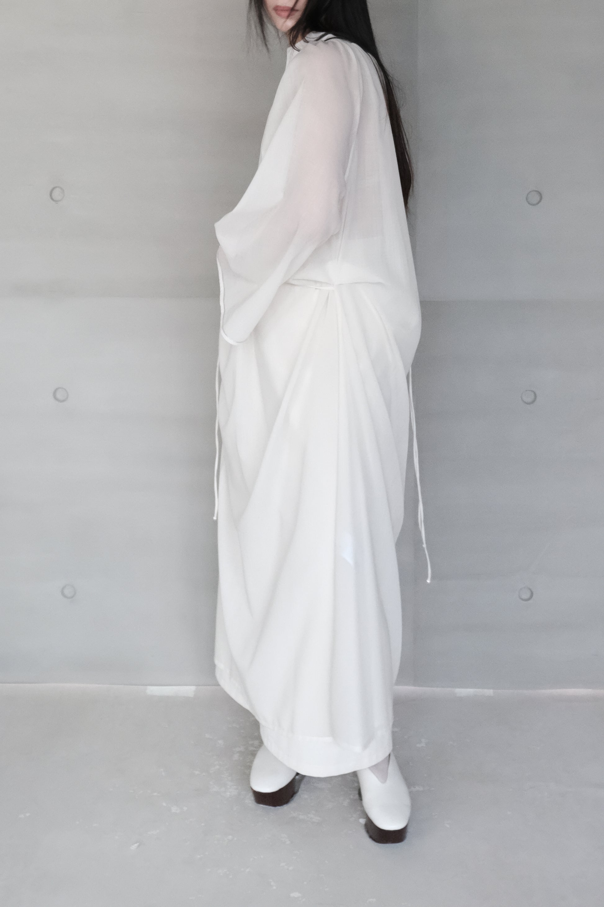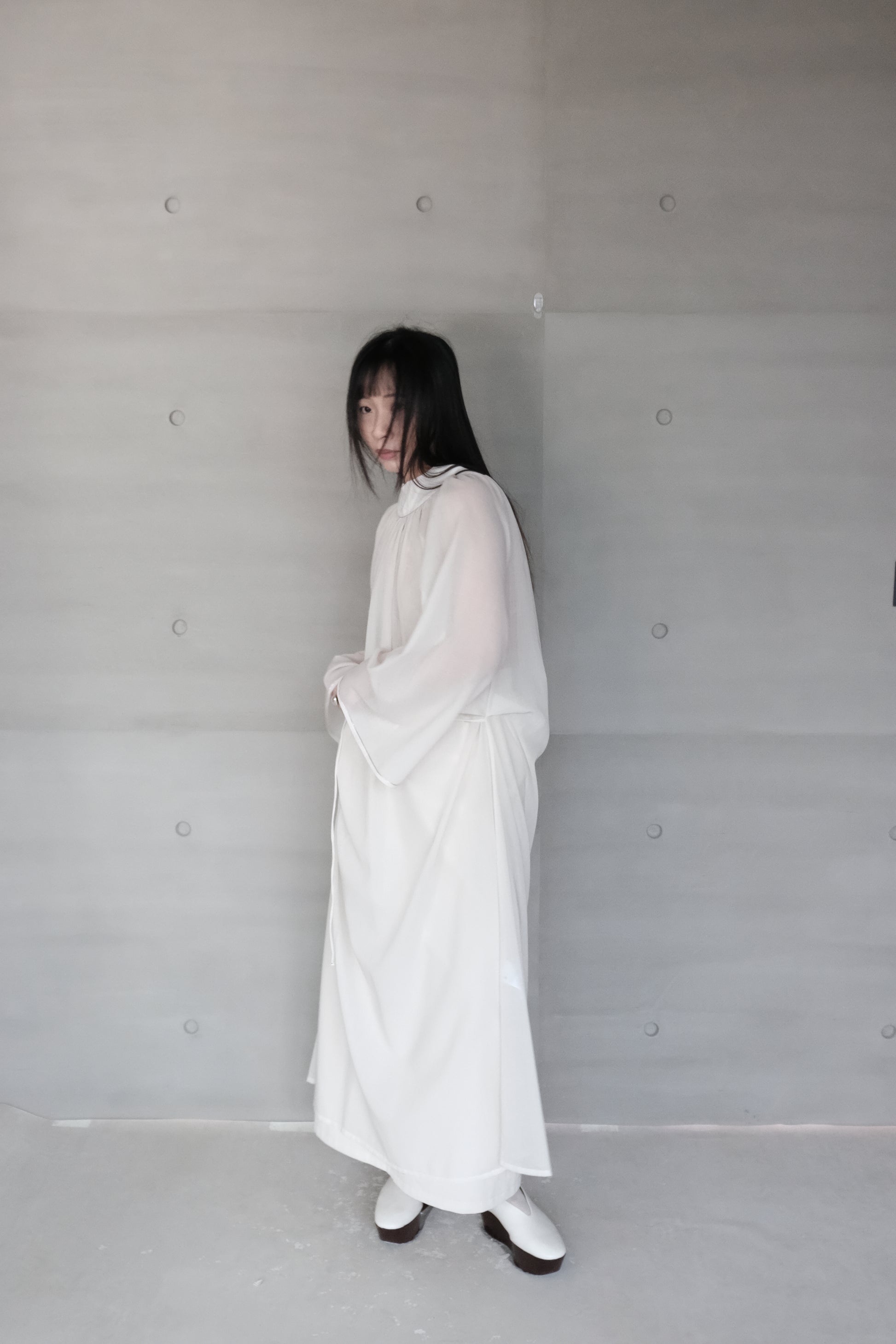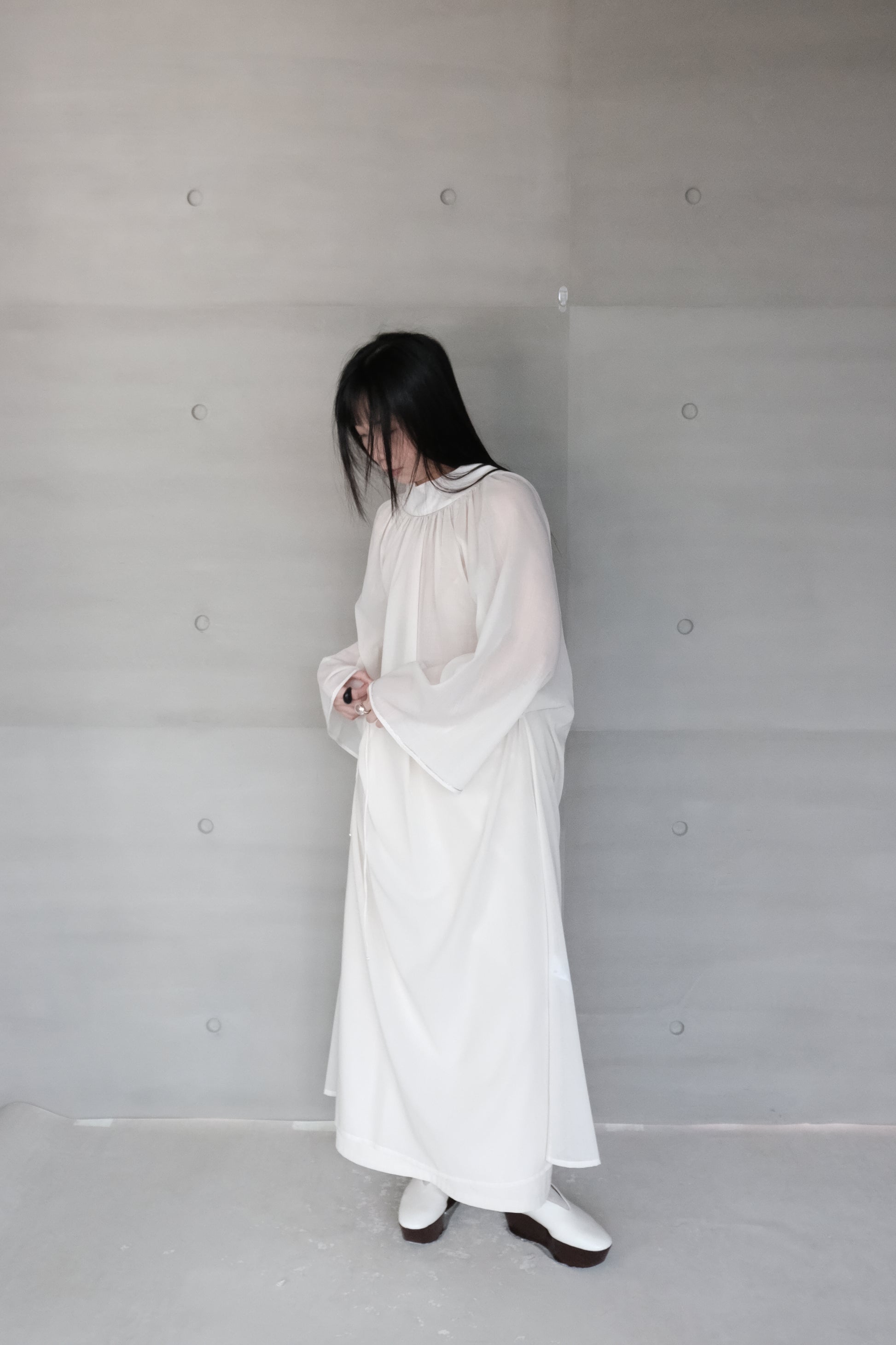 寬袖連衣洋裝,由柔軟的初剪羊毛與poly交織製成,縮褶領口,側面垂褶抓皺,條飾有銀珠做收邊。