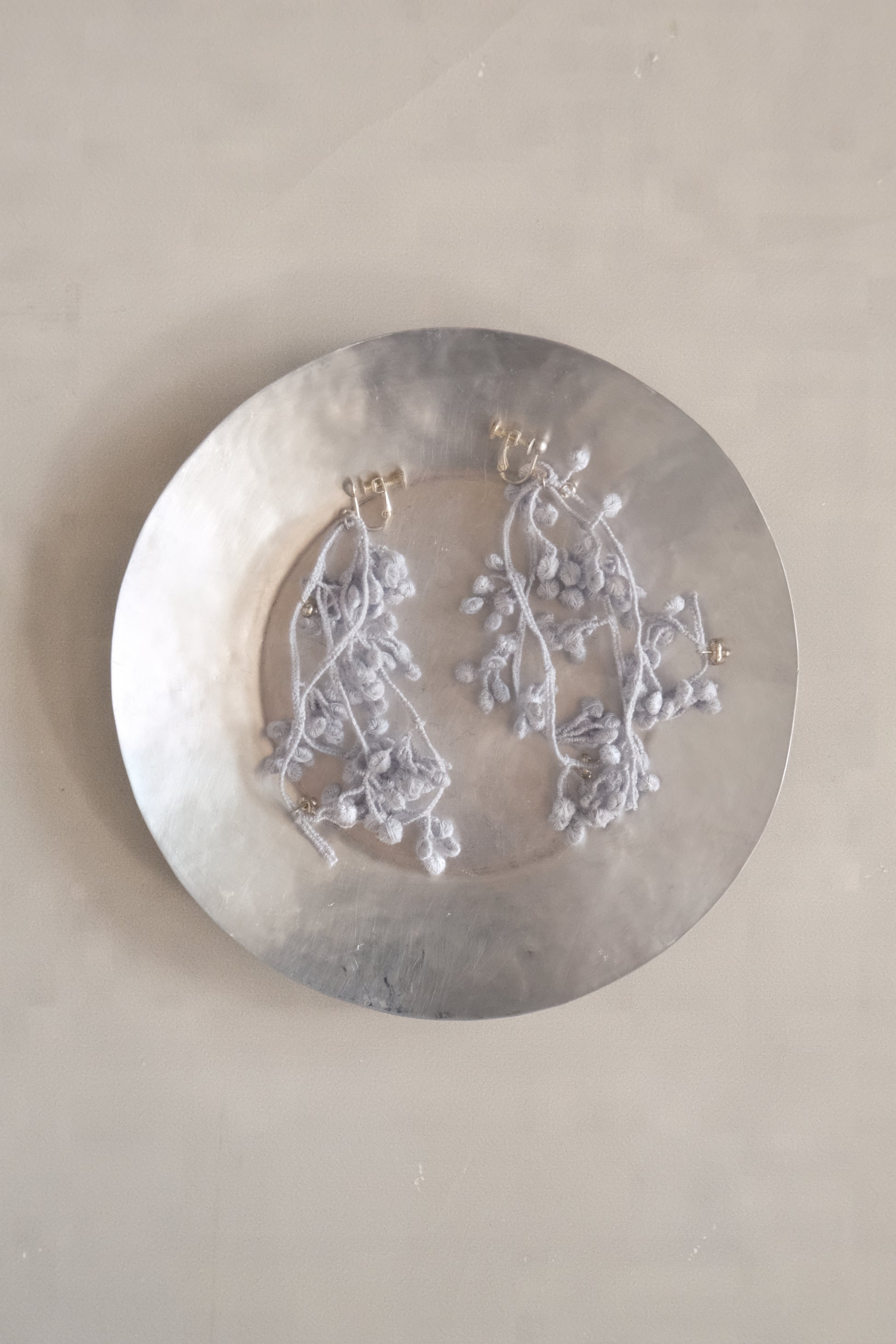 以細緻織帶手工編織出柔軟的小花造型,點綴銀色珠粒,呈現低調閃爍的光澤感。