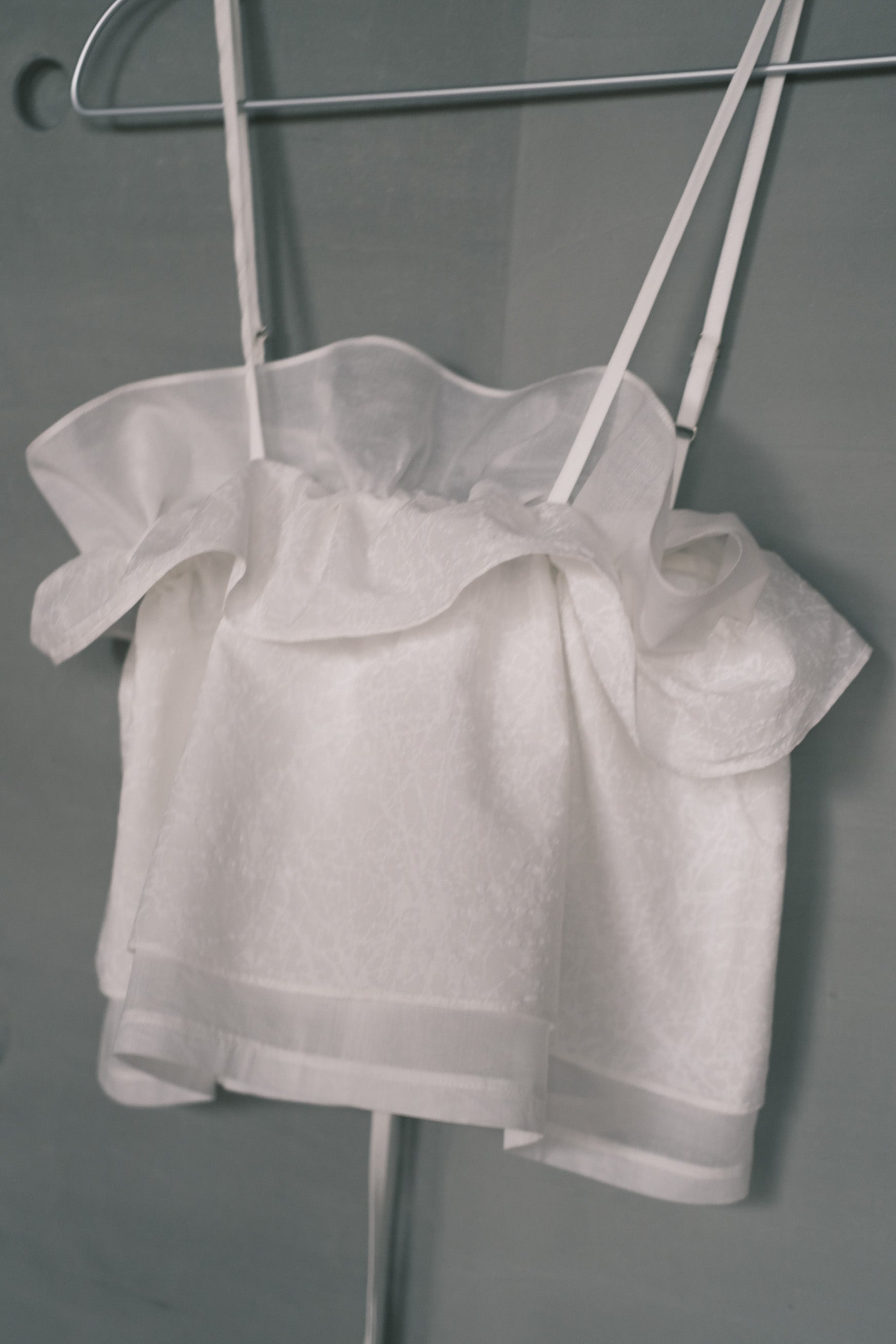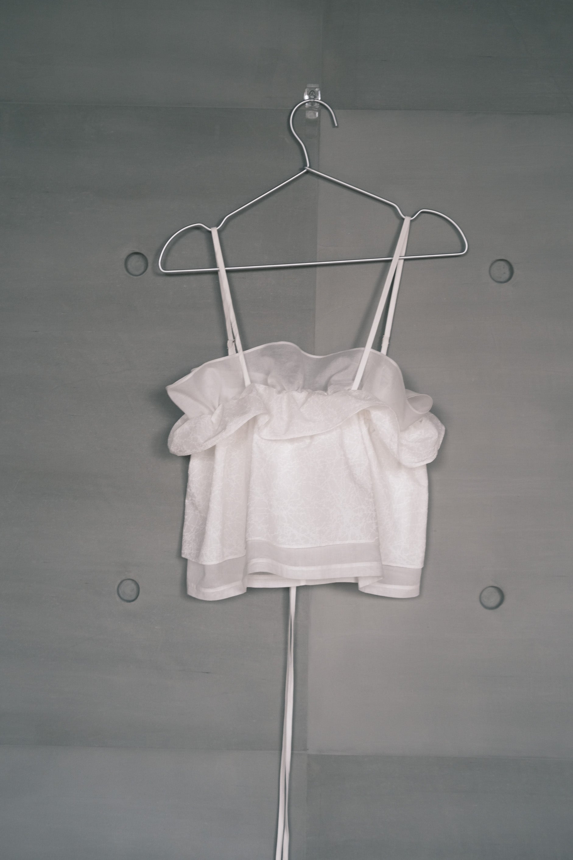 以工作室剩餘布料製作而成,延續布料生命並賦予新形式。雙層抽皺設計展現細緻層次感,小巧背心版型俐落簡潔。可依個人喜好調節,展現多種穿法,適合單穿或作為層次搭配。