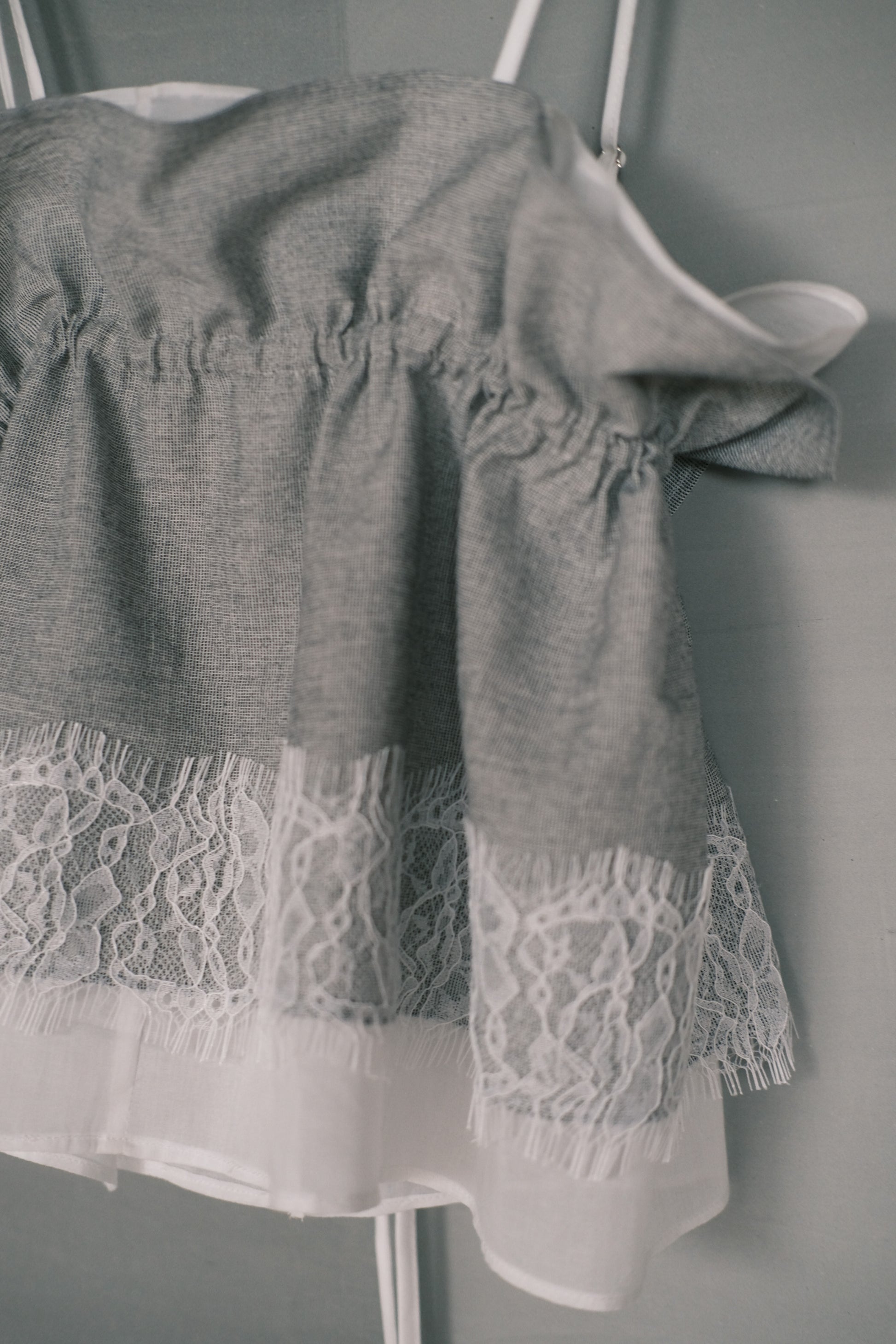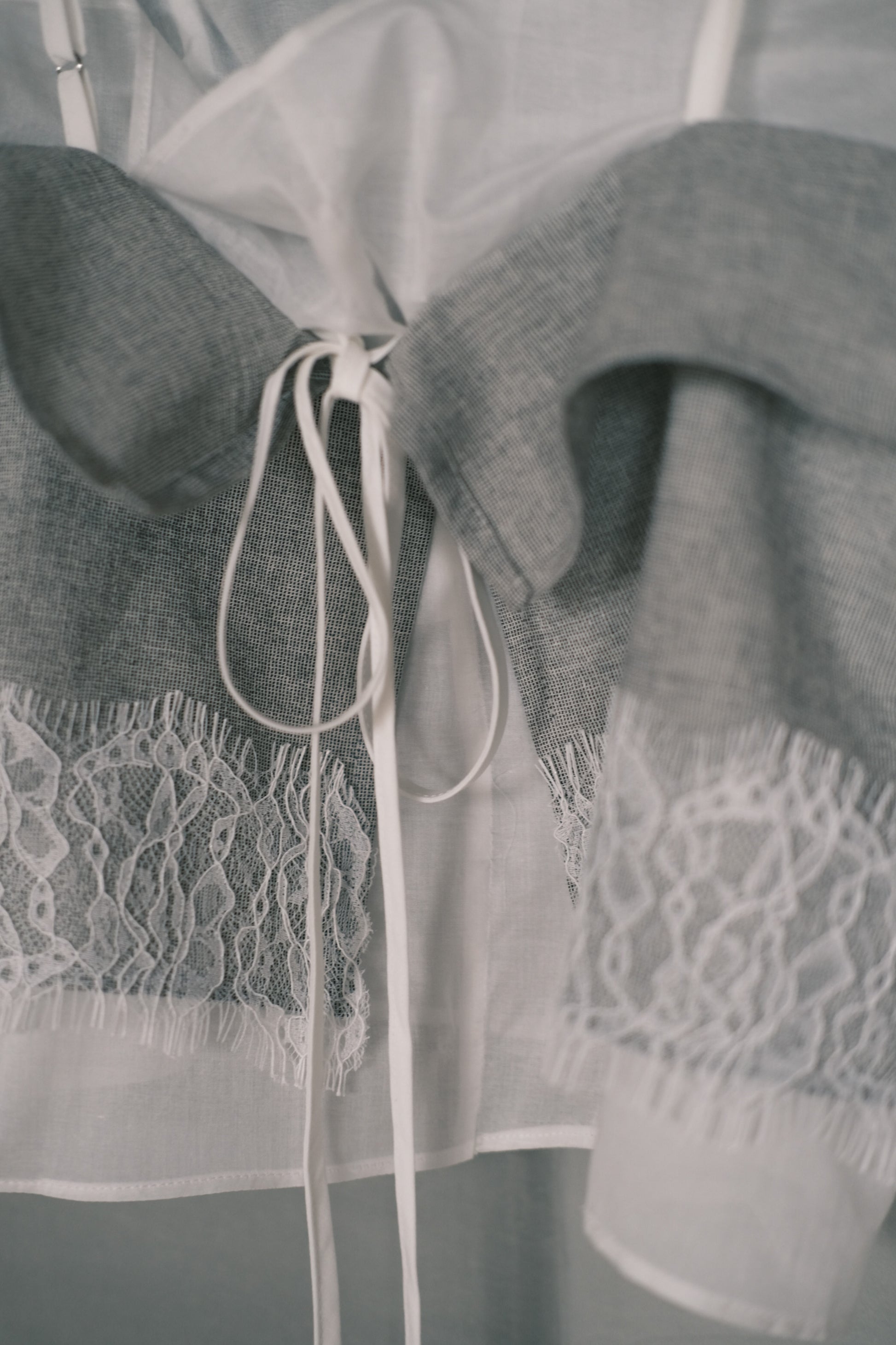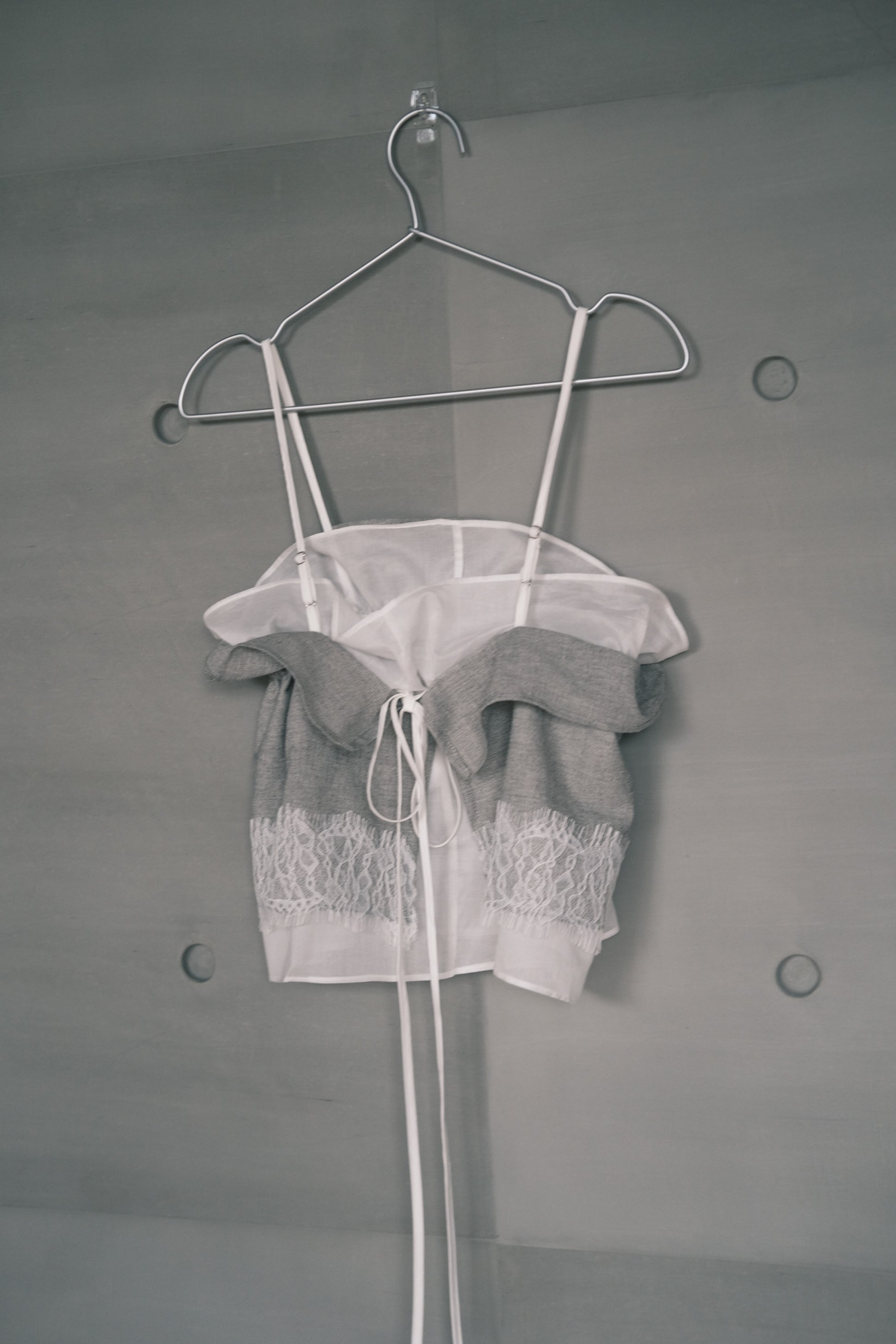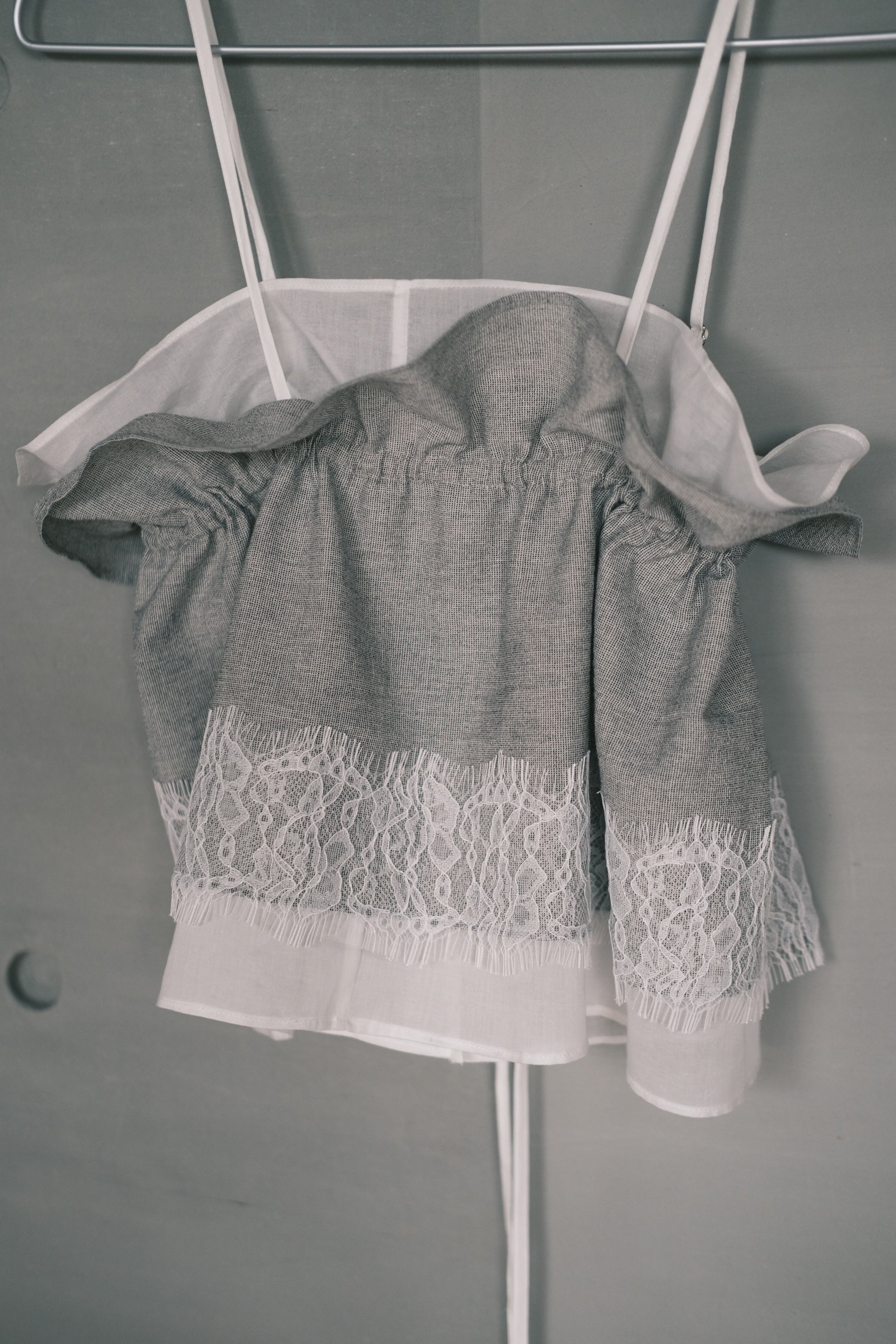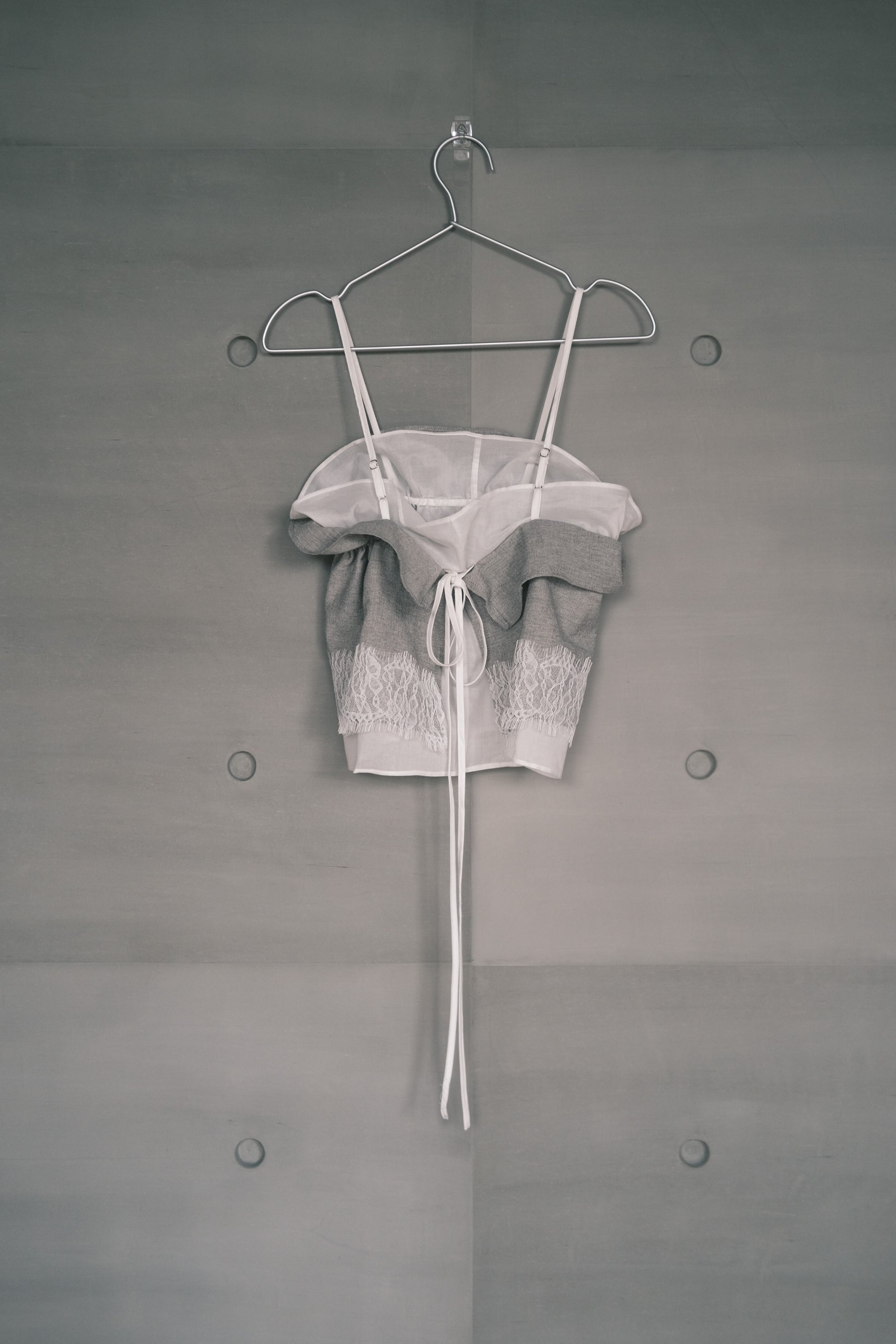 以工作室剩餘布料製作而成,延續布料生命並賦予新形式。雙層抽皺設計展現細緻層次感,小巧背心版型俐落簡潔。可依個人喜好調節,展現多種穿法,適合單穿或作為層次搭配。