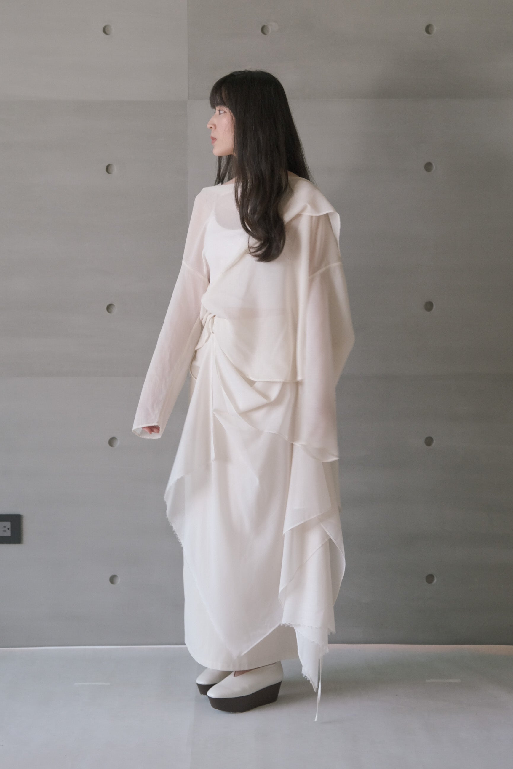 Crafted from a Japanese wool-polyester blend, this straight skirt features a structured yet soft texture that offers both warmth and comfort. The clean straight-cut silhouette flatters the figure, creating an elegant, streamlined look. A distinctive draped tie detail at the front allows for adjustable styling, adding versatility and visual interest. Lightweight and easy to wear, this skirt blends functionality with modern design—perfect for effortless everyday styling.
